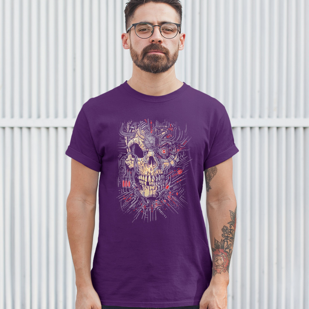 CYBORG SKULL FACE t-shirt scary cyberpunk robot horror men's tee purple
