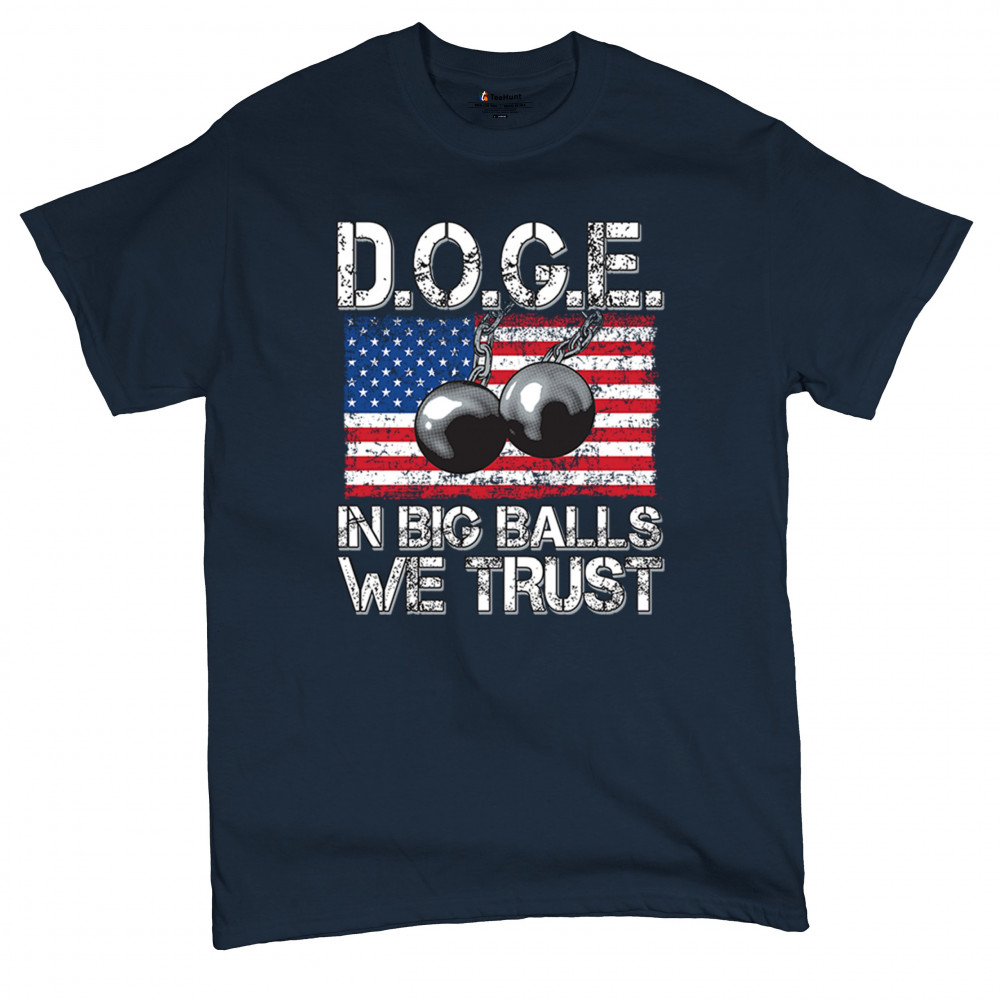 The D.O.G.E. In Big Balls We Trust design blends patriotic grit with sharp political satire. Featuring chained wrecking balls over a distressed American flag, this graphic hits hard. Perfect for conservative men, bold personalities, and political events like rallies, debates, and meetups.