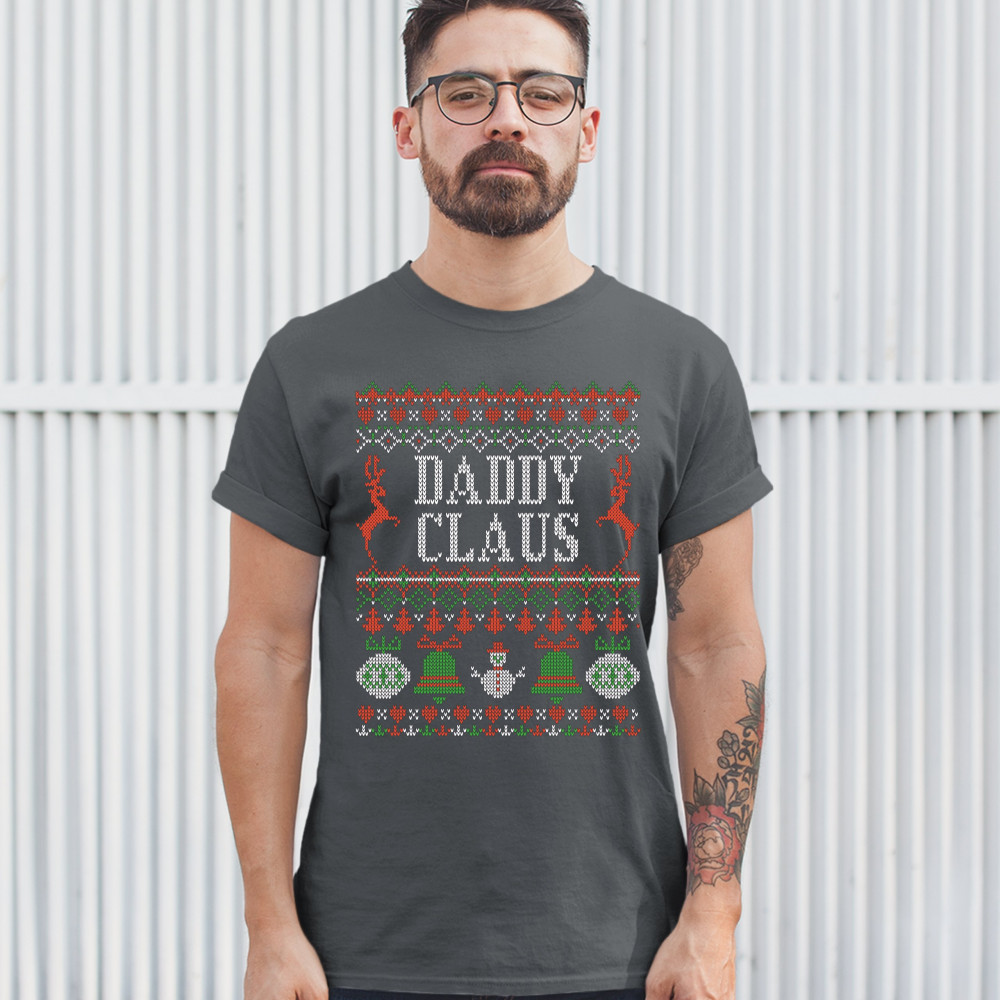 A print saying: "Daddy Claus" and featuring two reindeers, a snowman and two bells. The print is designed as an ugly sweater. Amazing choice to make people smile and spread positive vibes on Christmas Eve.