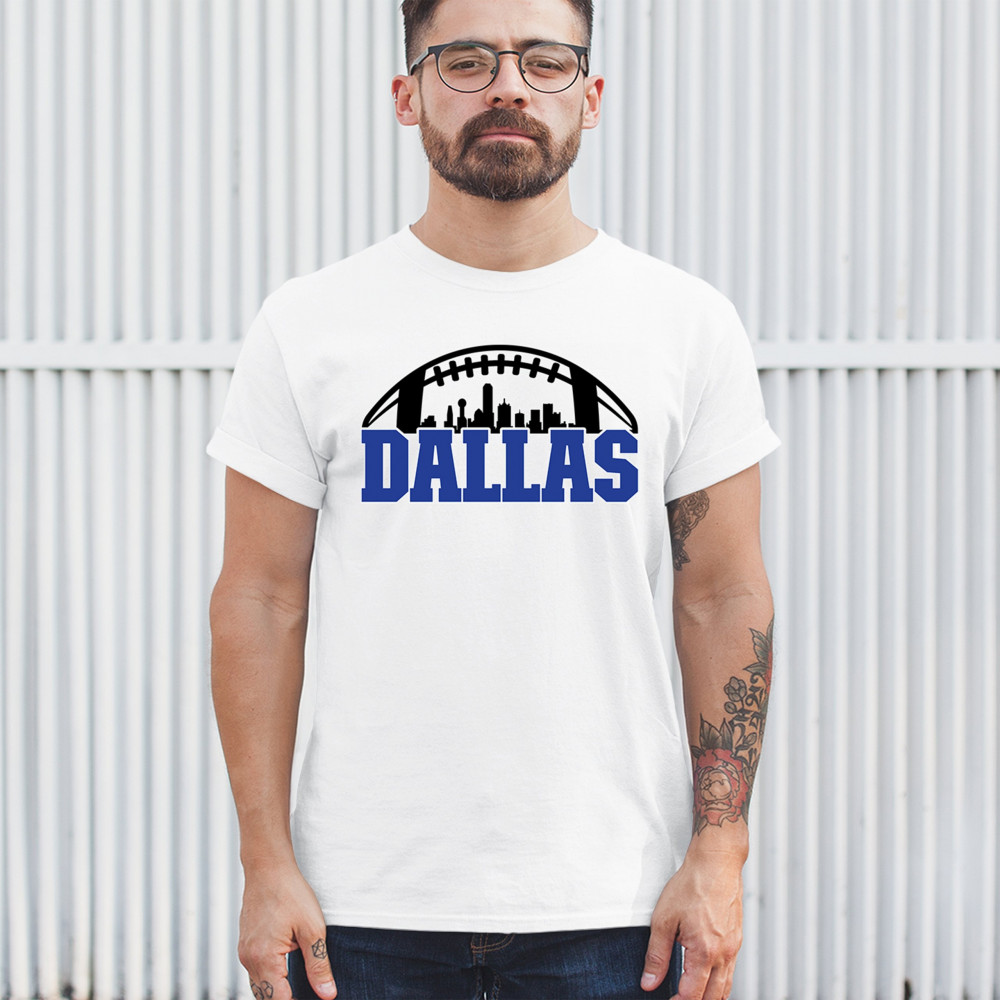 Show off your Dallas pride with a bold football-themed design featuring the city's skyline. Perfect for game days, tailgates, and passionate fans.