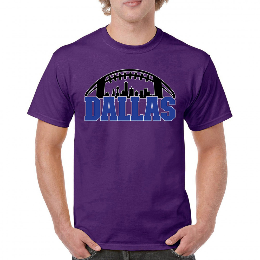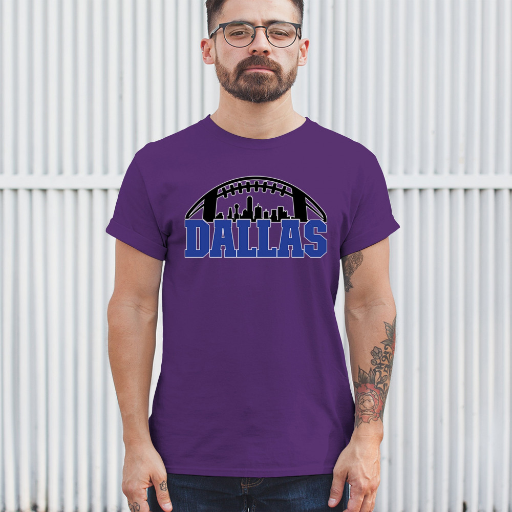 Show off your Dallas pride with a bold football-themed design featuring the city's skyline. Perfect for game days, tailgates, and passionate fans.