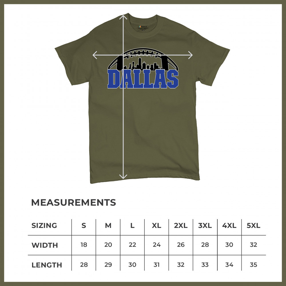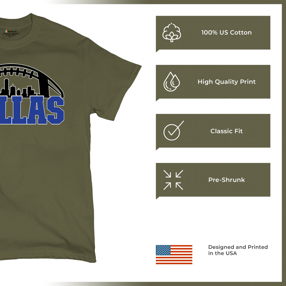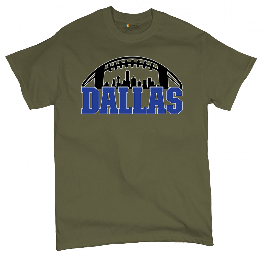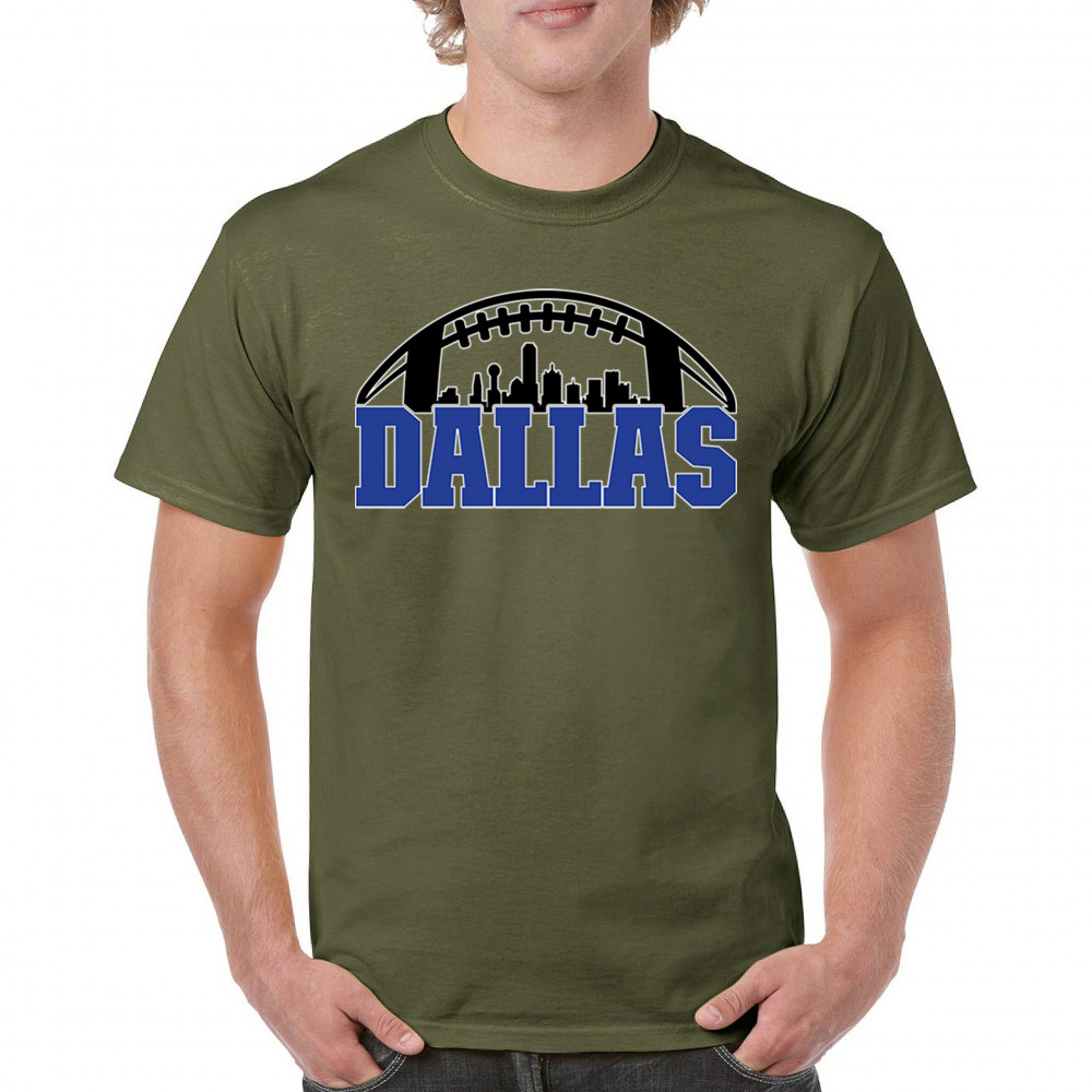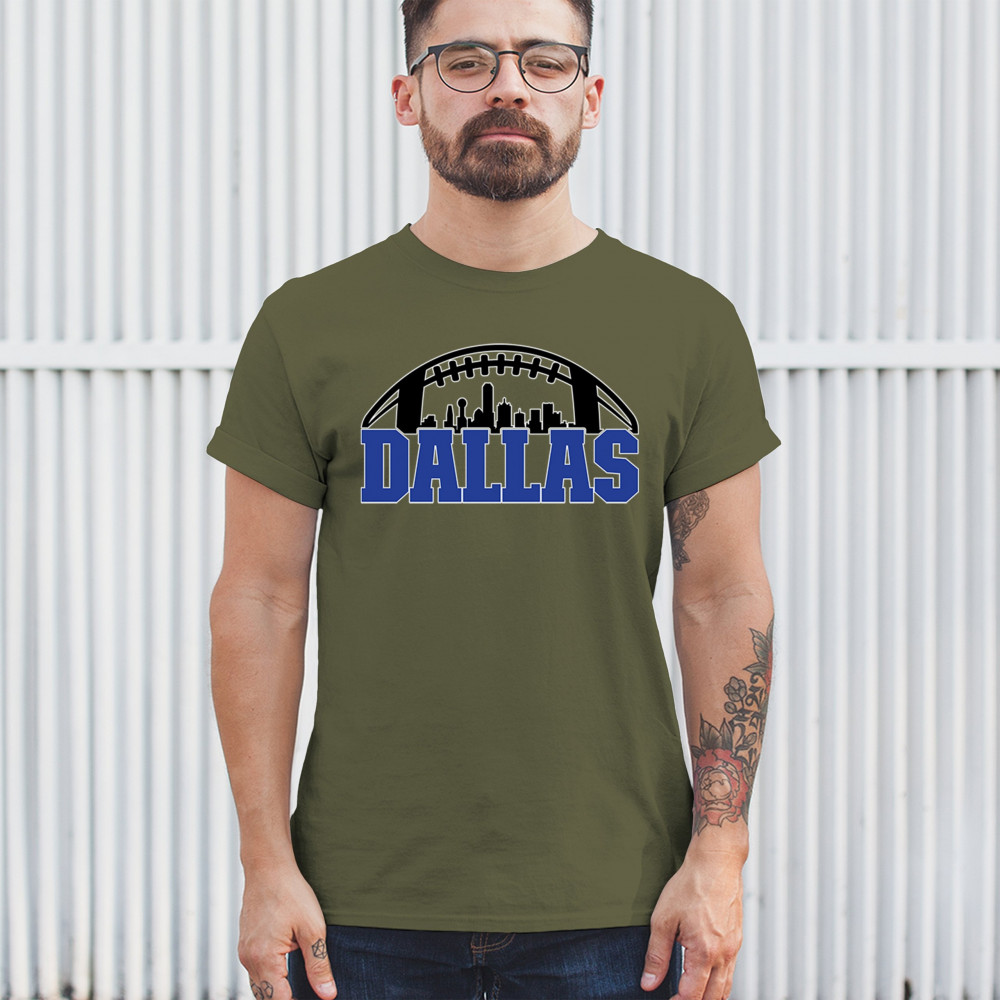 Show off your Dallas pride with a bold football-themed design featuring the city's skyline. Perfect for game days, tailgates, and passionate fans.