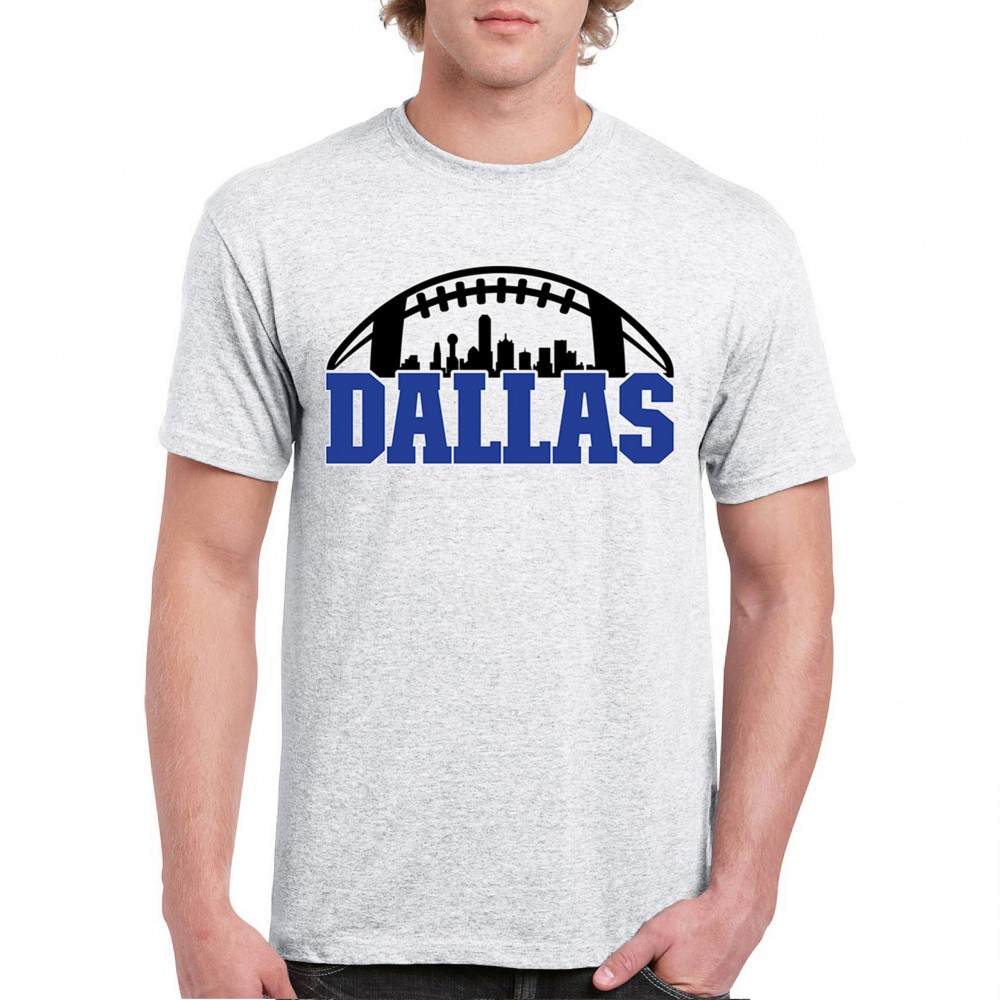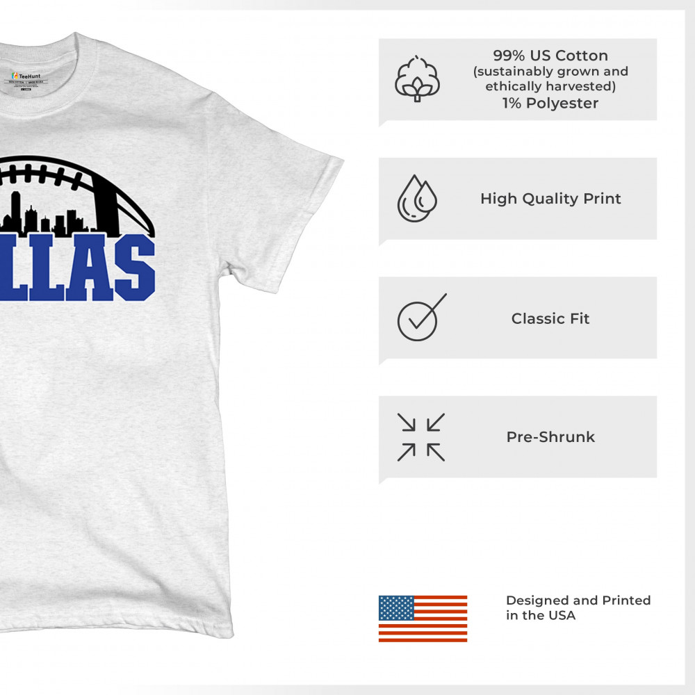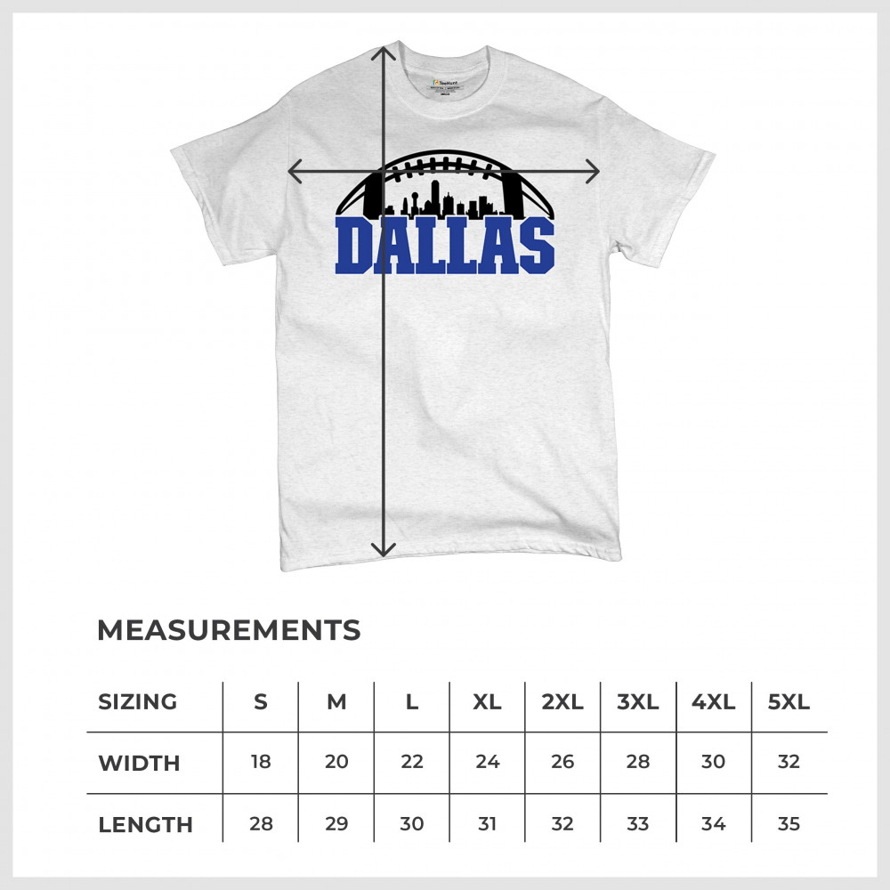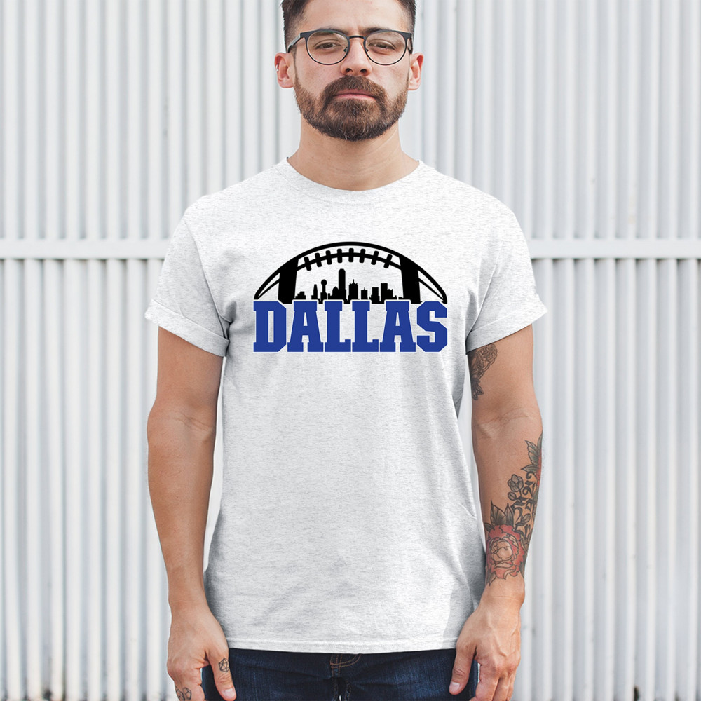Show off your Dallas pride with a bold football-themed design featuring the city's skyline. Perfect for game days, tailgates, and passionate fans.