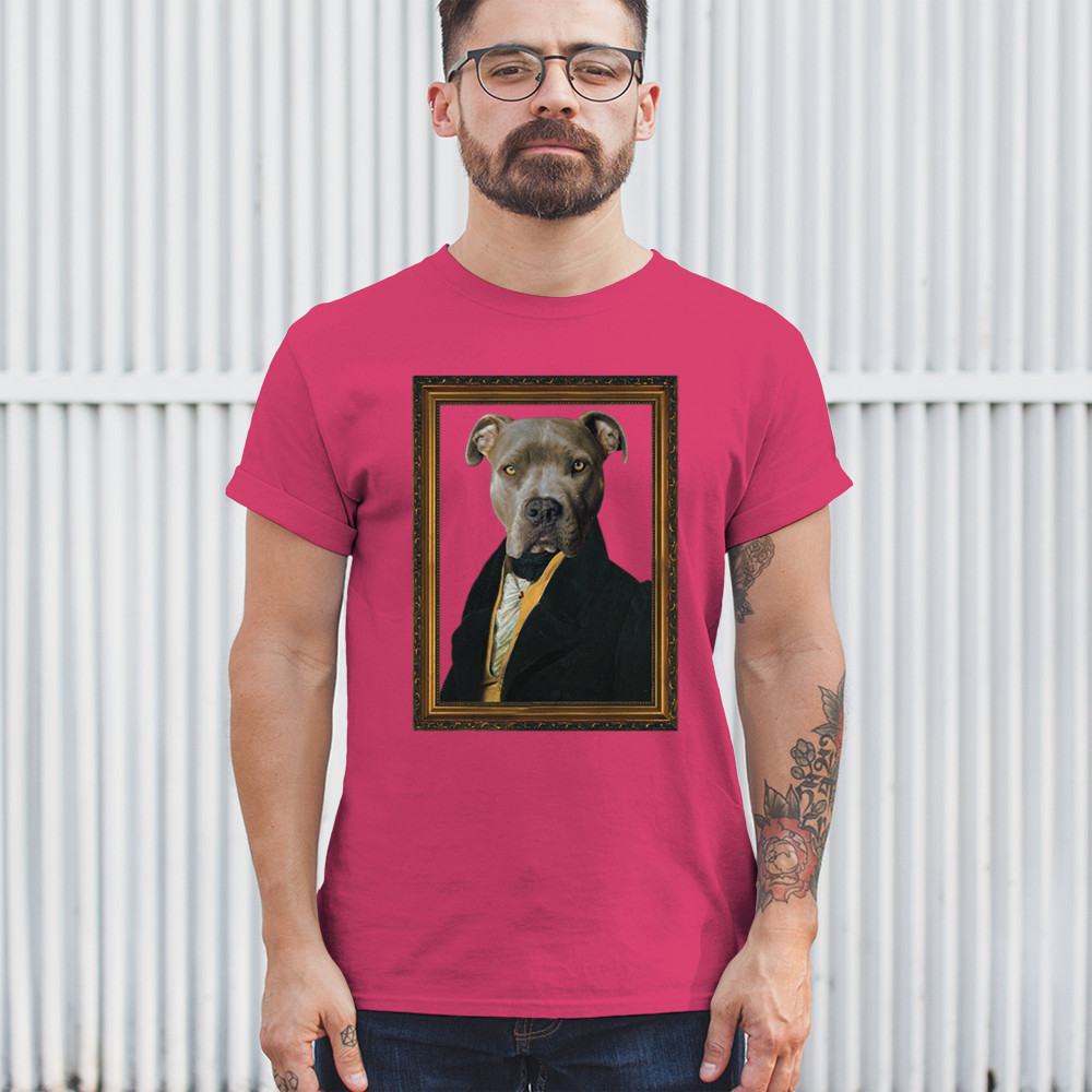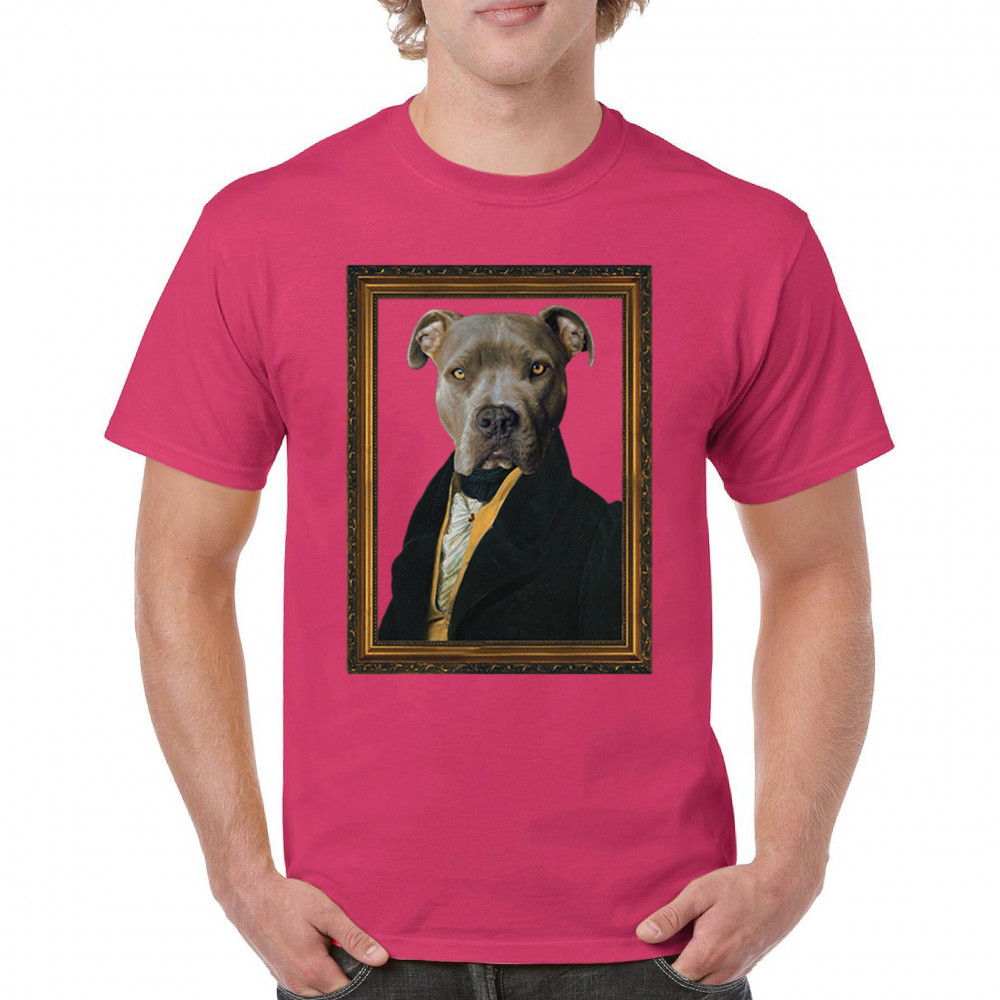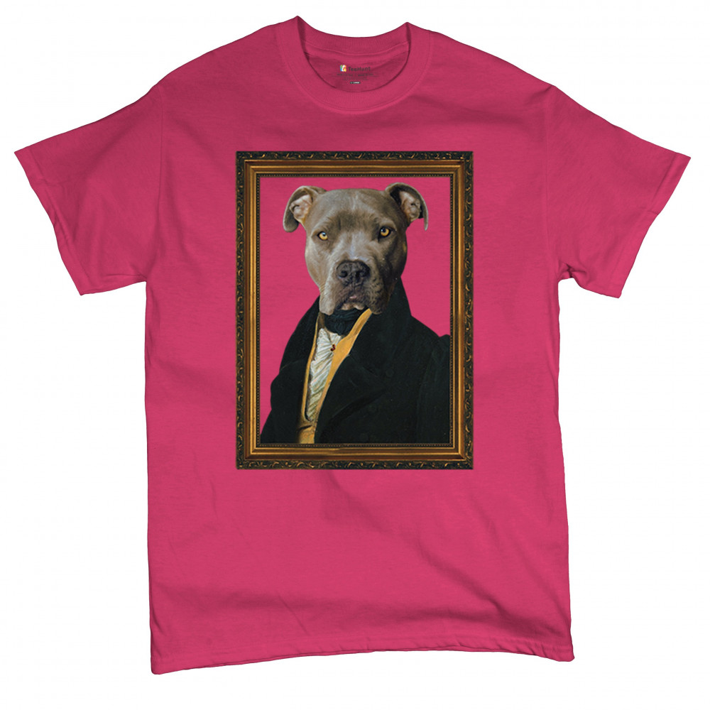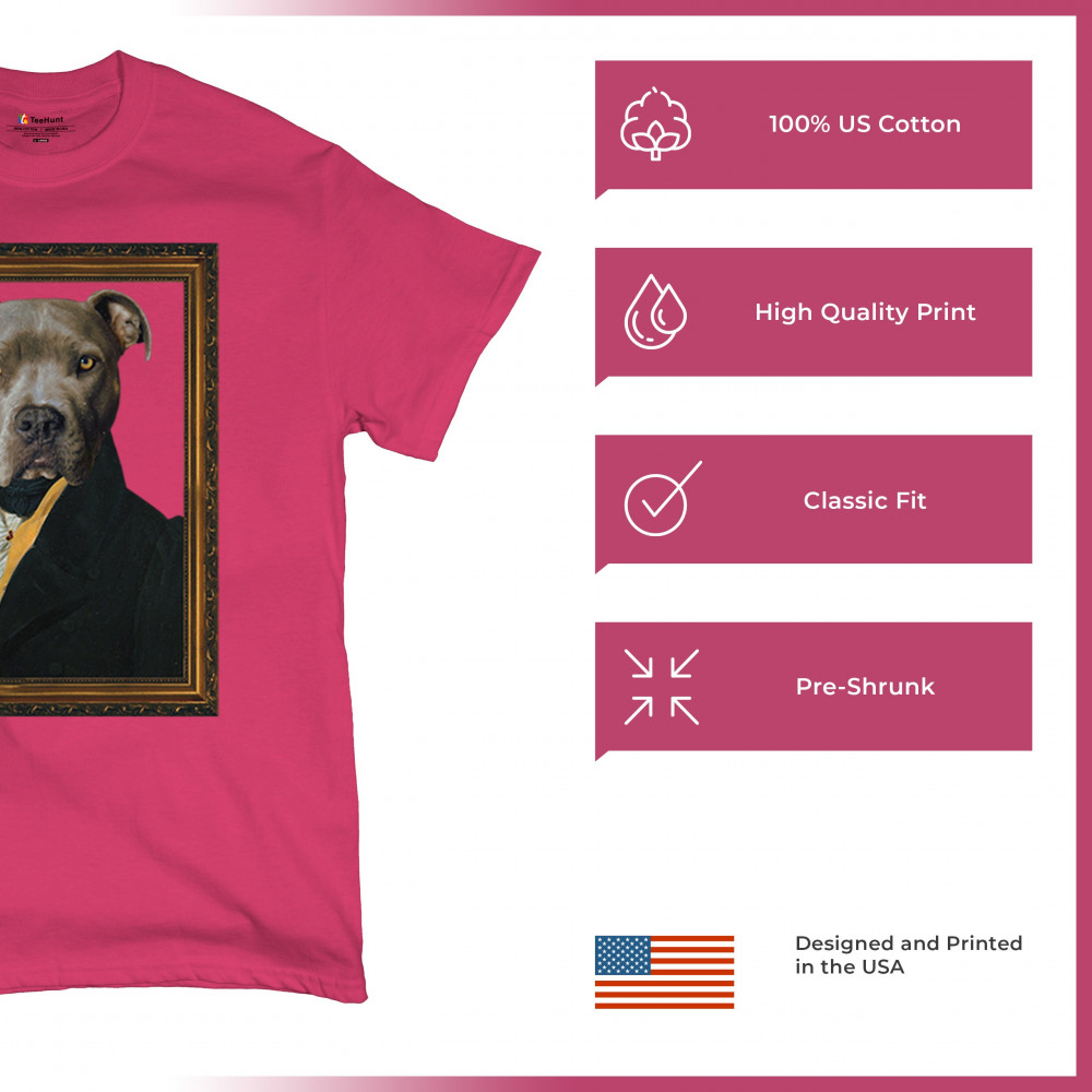Unique pit bull portrait in 18th-century attire, blending humor and elegance for pet lovers and history enthusiasts. Perfect for home or office decor.