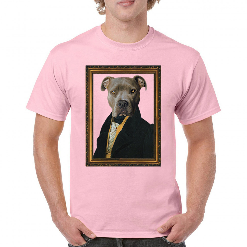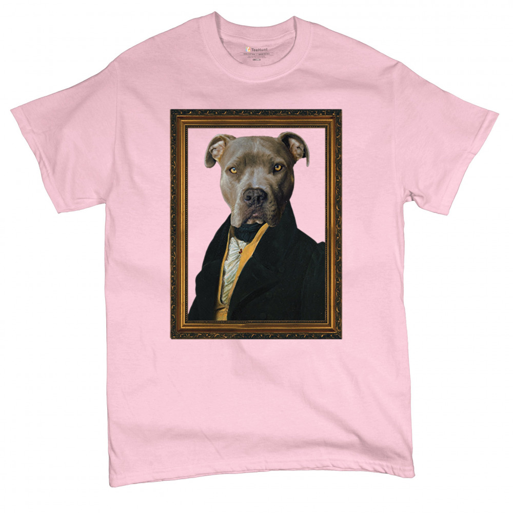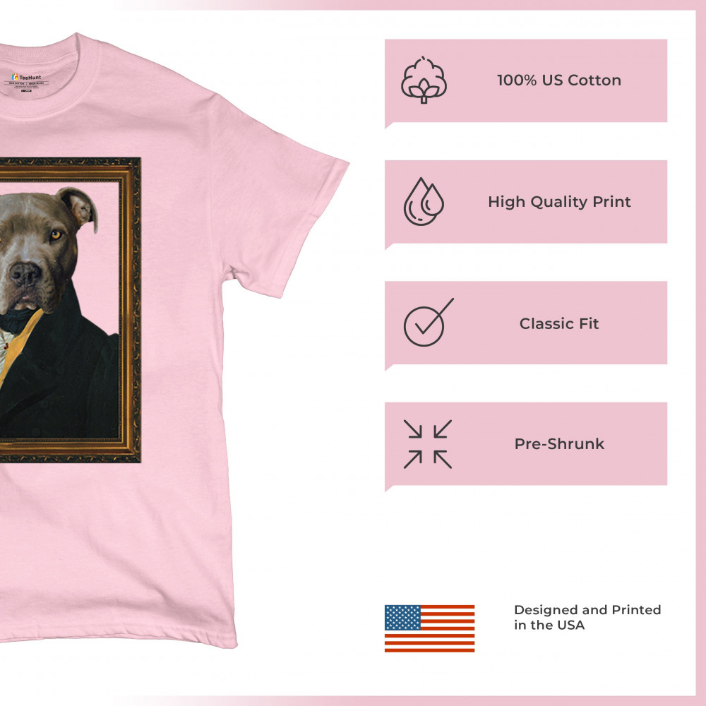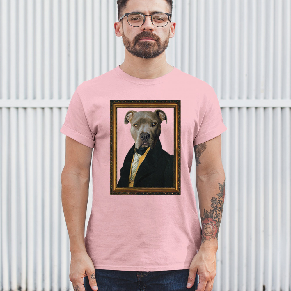 Unique pit bull portrait in 18th-century attire, blending humor and elegance for pet lovers and history enthusiasts. Perfect for home or office decor.