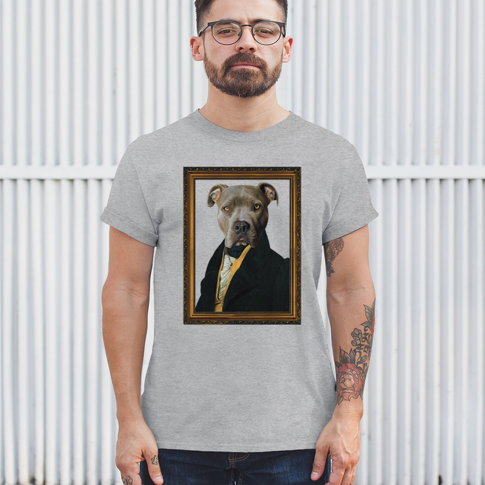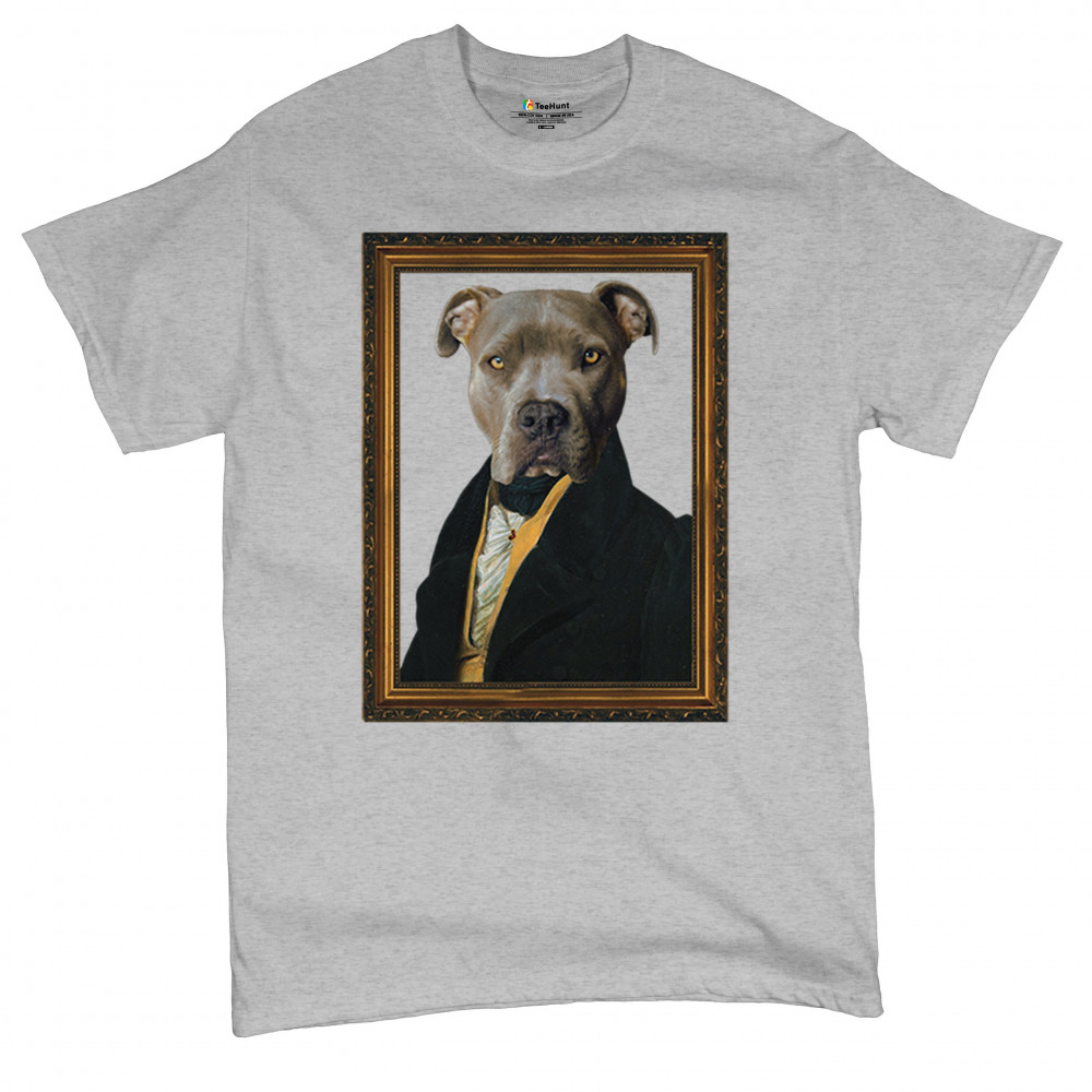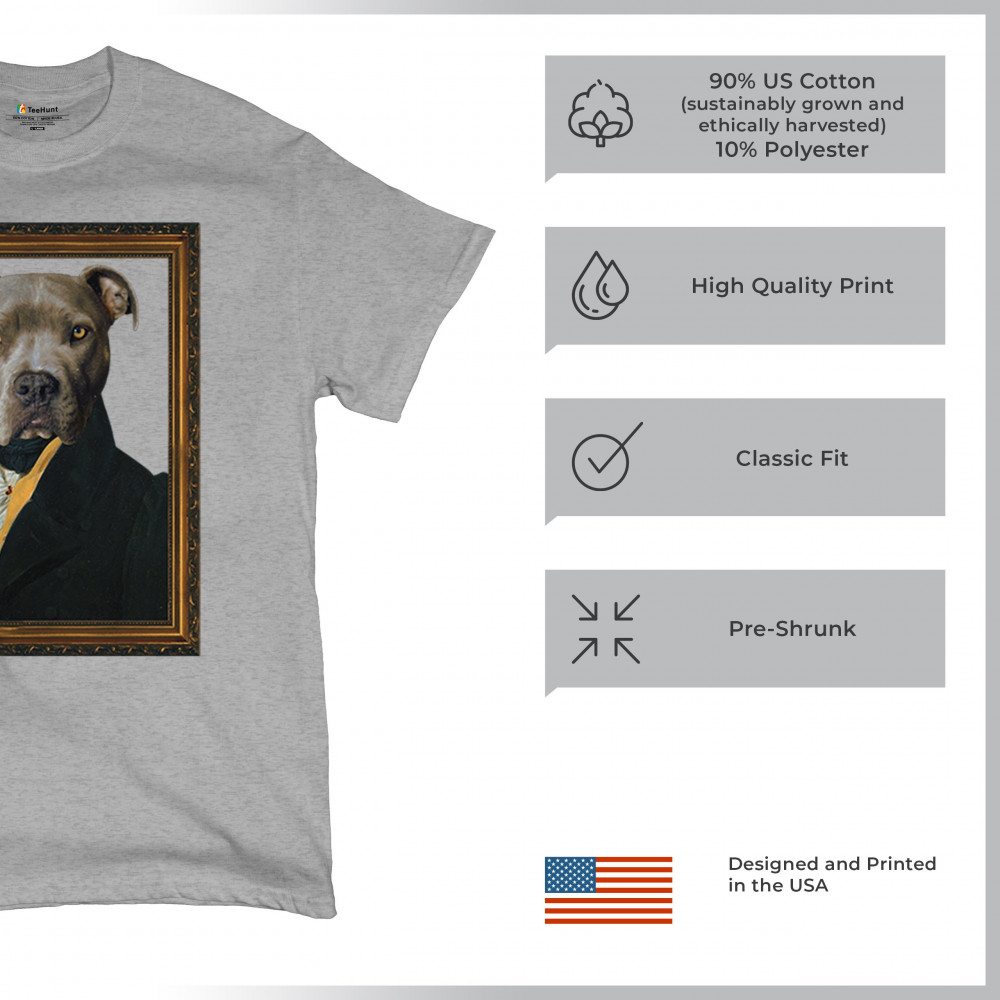 Unique pit bull portrait in 18th-century attire, blending humor and elegance for pet lovers and history enthusiasts. Perfect for home or office decor.