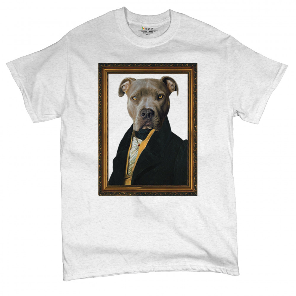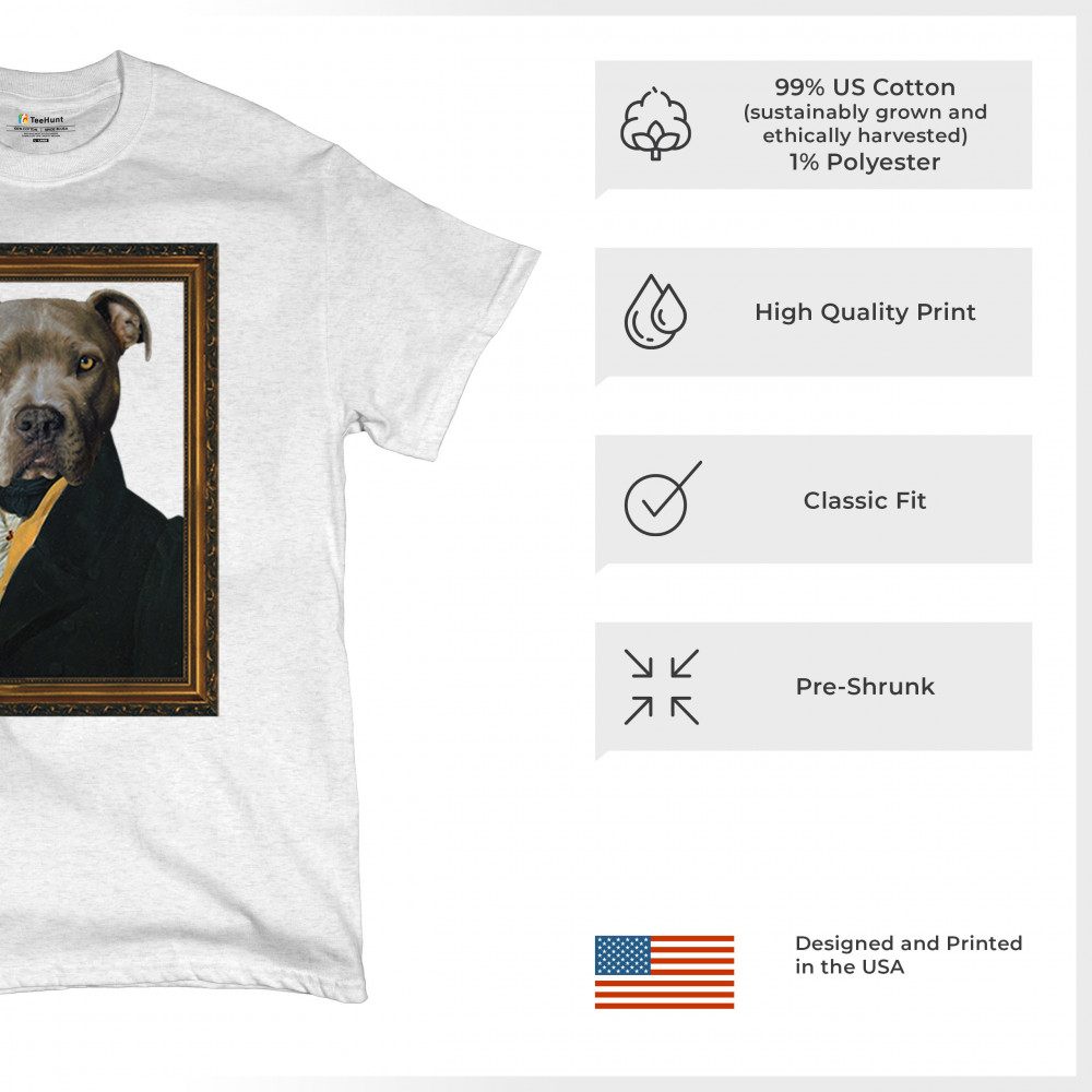Unique pit bull portrait in 18th-century attire, blending humor and elegance for pet lovers and history enthusiasts. Perfect for home or office decor.