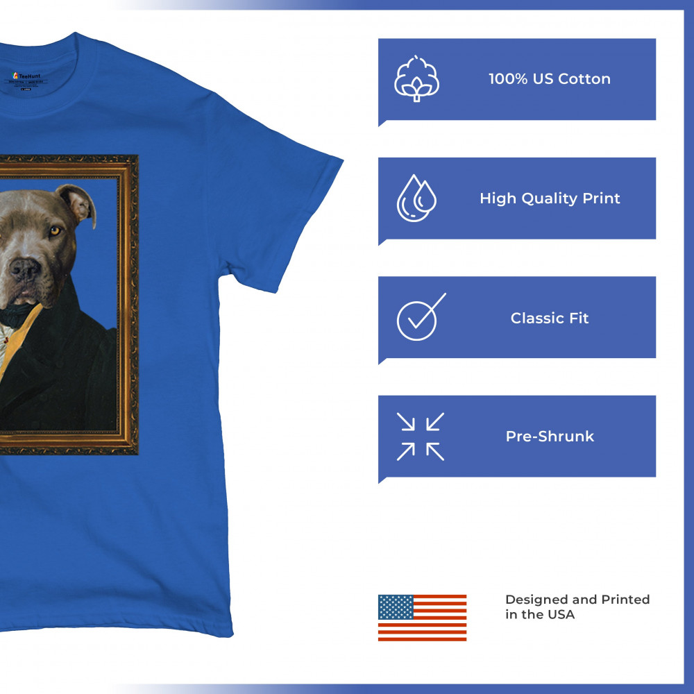 Unique pit bull portrait in 18th-century attire, blending humor and elegance for pet lovers and history enthusiasts. Perfect for home or office decor.