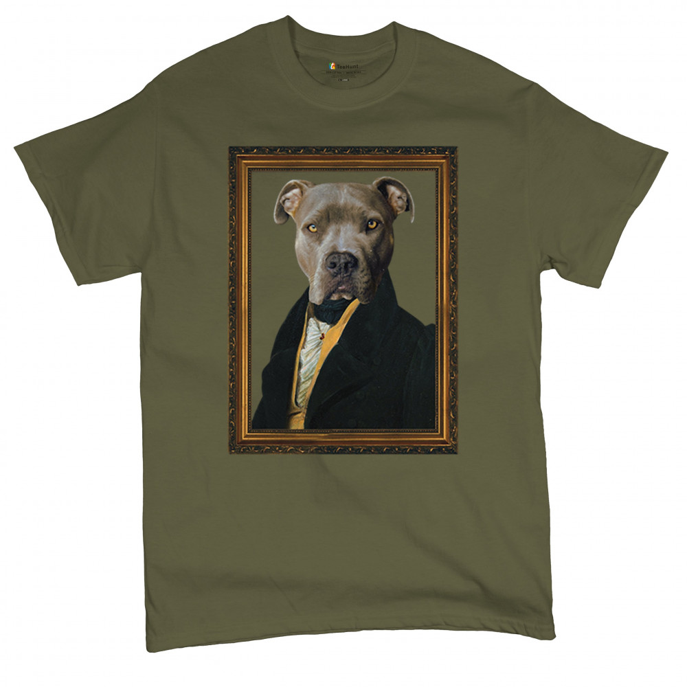 Unique pit bull portrait in 18th-century attire, blending humor and elegance for pet lovers and history enthusiasts. Perfect for home or office decor.