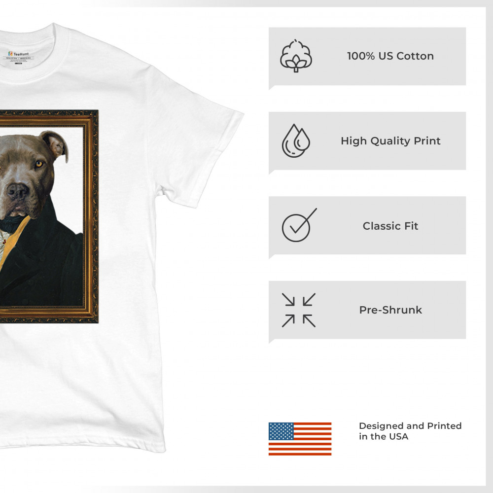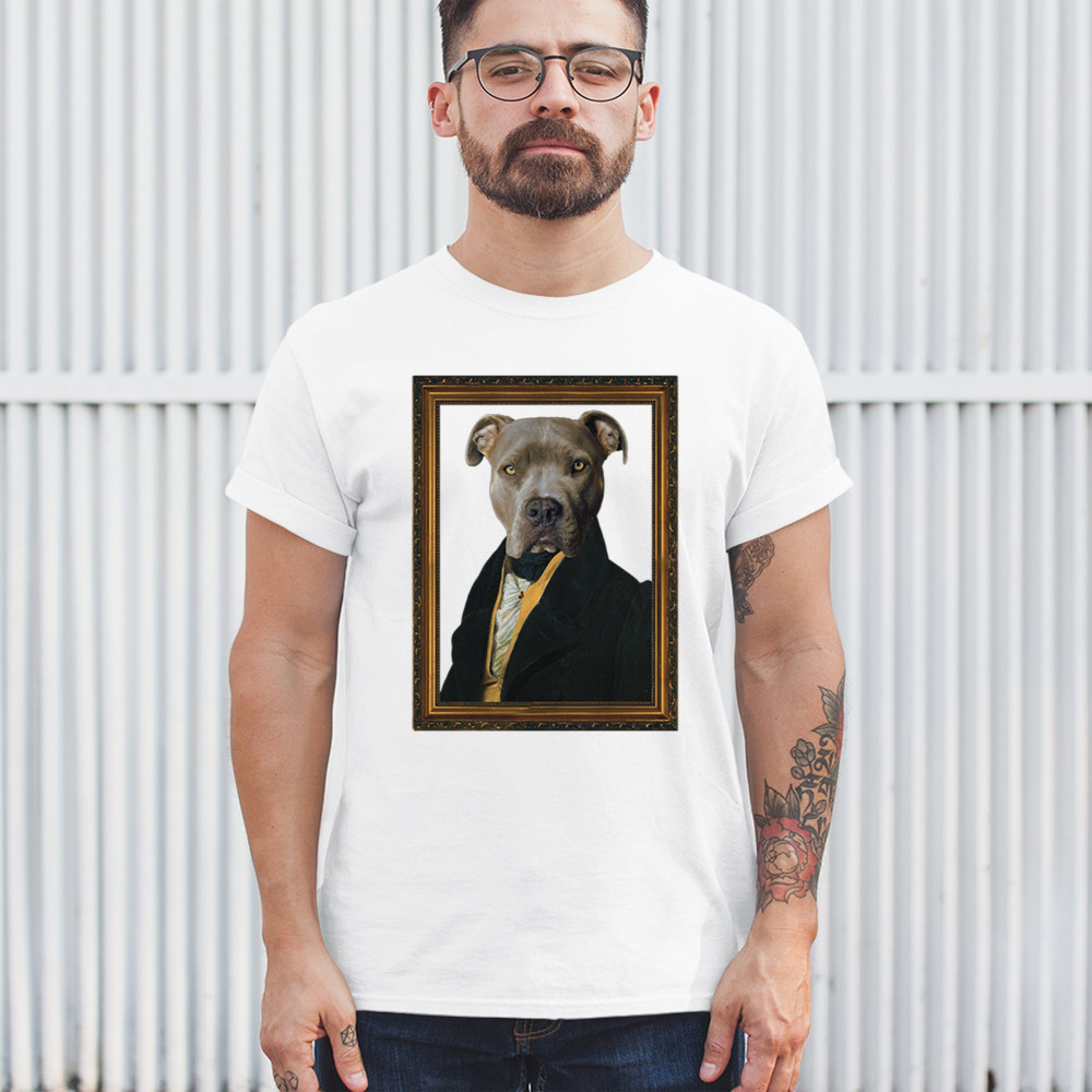 Unique pit bull portrait in 18th-century attire, blending humor and elegance for pet lovers and history enthusiasts. Perfect for home or office decor.