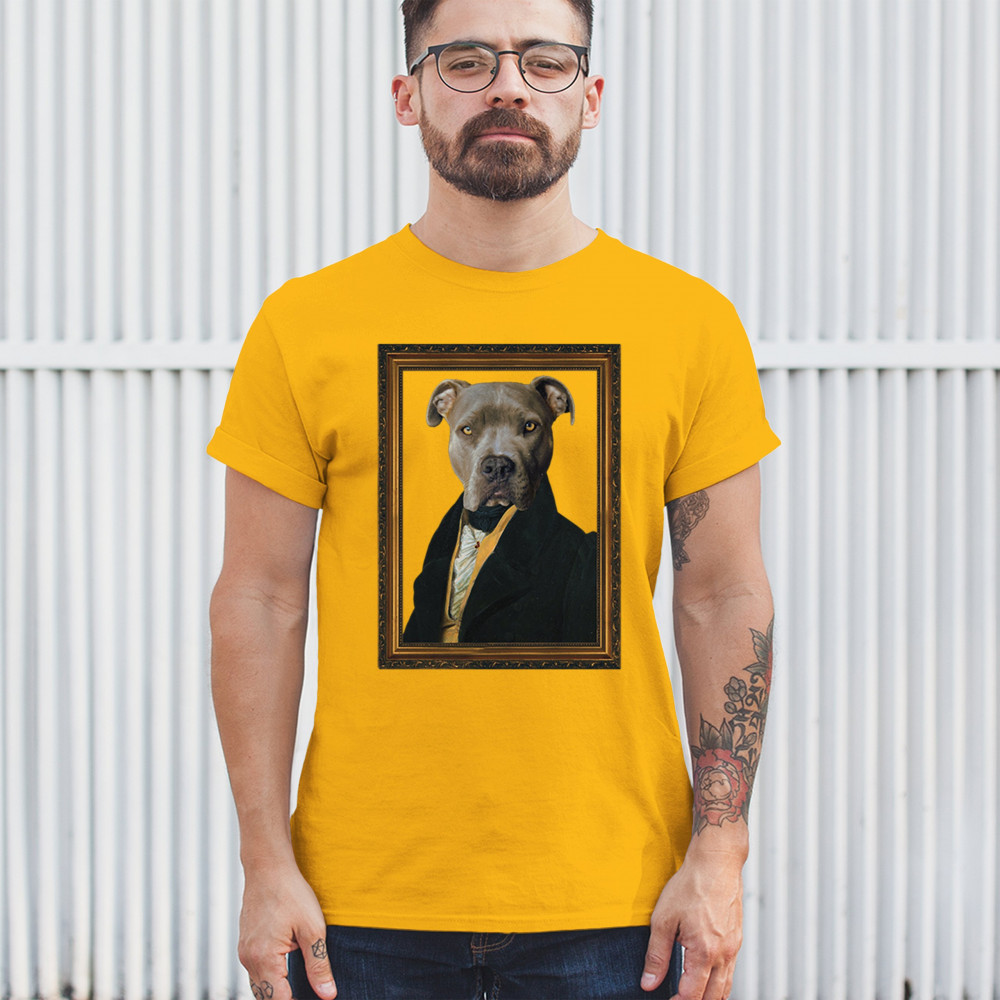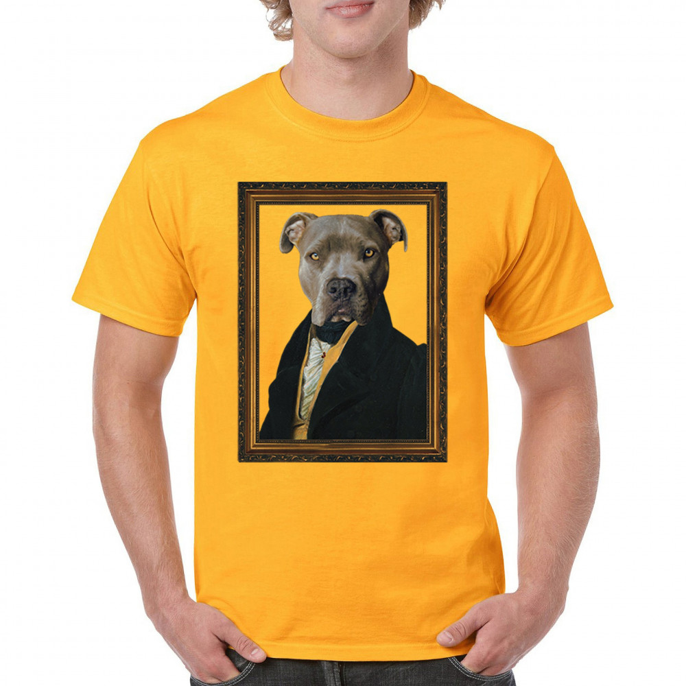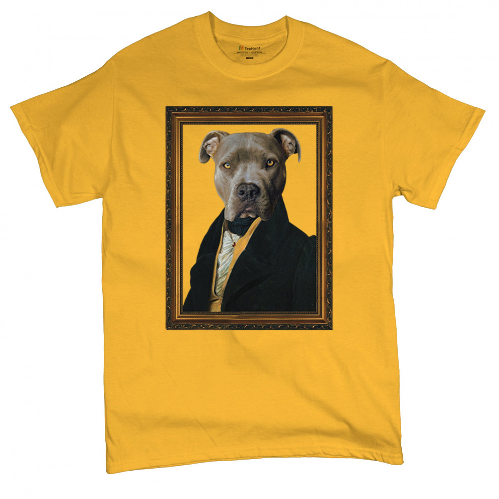 Unique pit bull portrait in 18th-century attire, blending humor and elegance for pet lovers and history enthusiasts. Perfect for home or office decor.