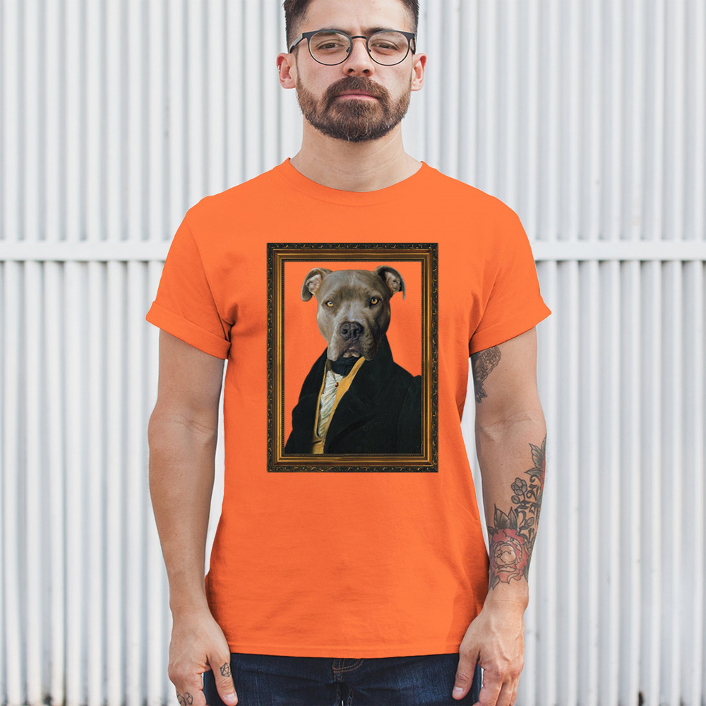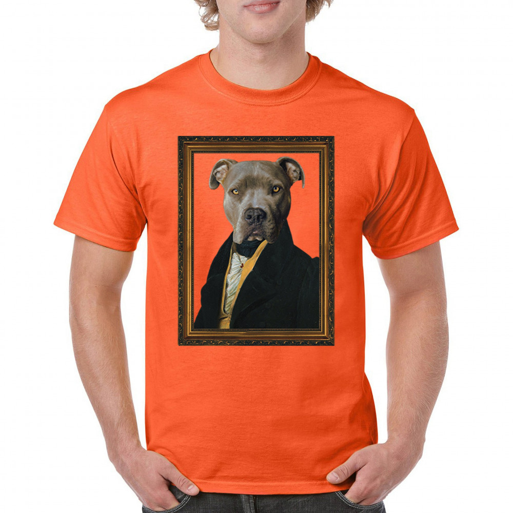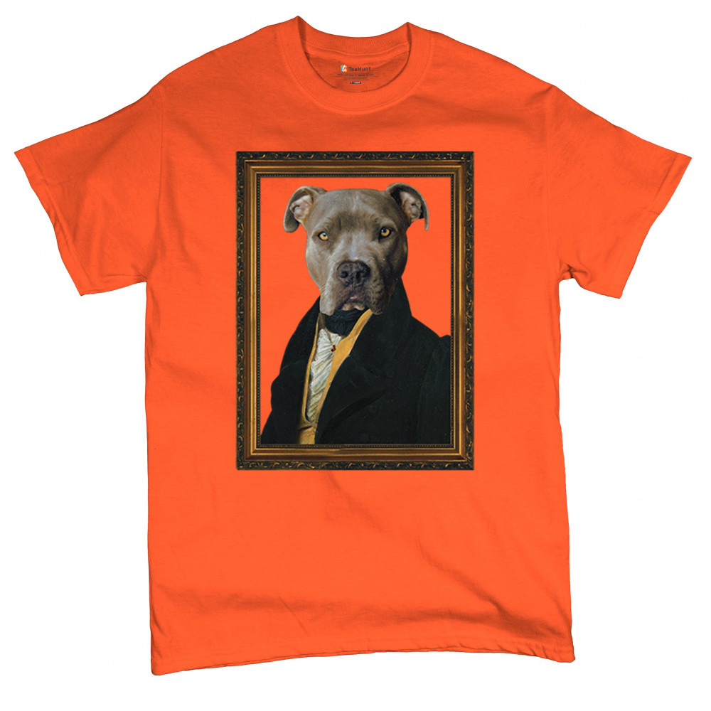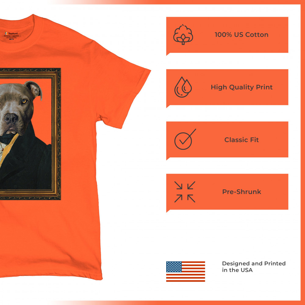 Unique pit bull portrait in 18th-century attire, blending humor and elegance for pet lovers and history enthusiasts. Perfect for home or office decor.