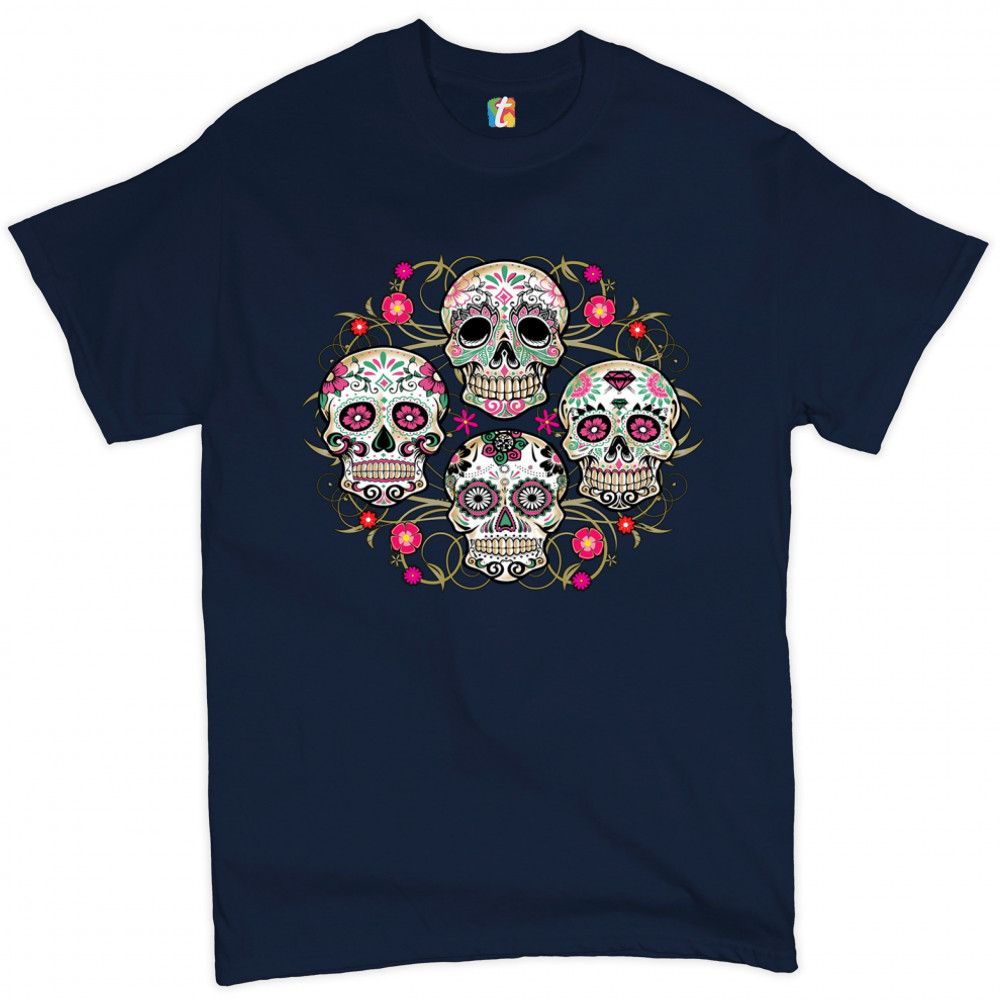 DAY OF THE DEAD FLORAL SUGAR SKULLS t-shirt dia de los muertos men's tee navy blue
