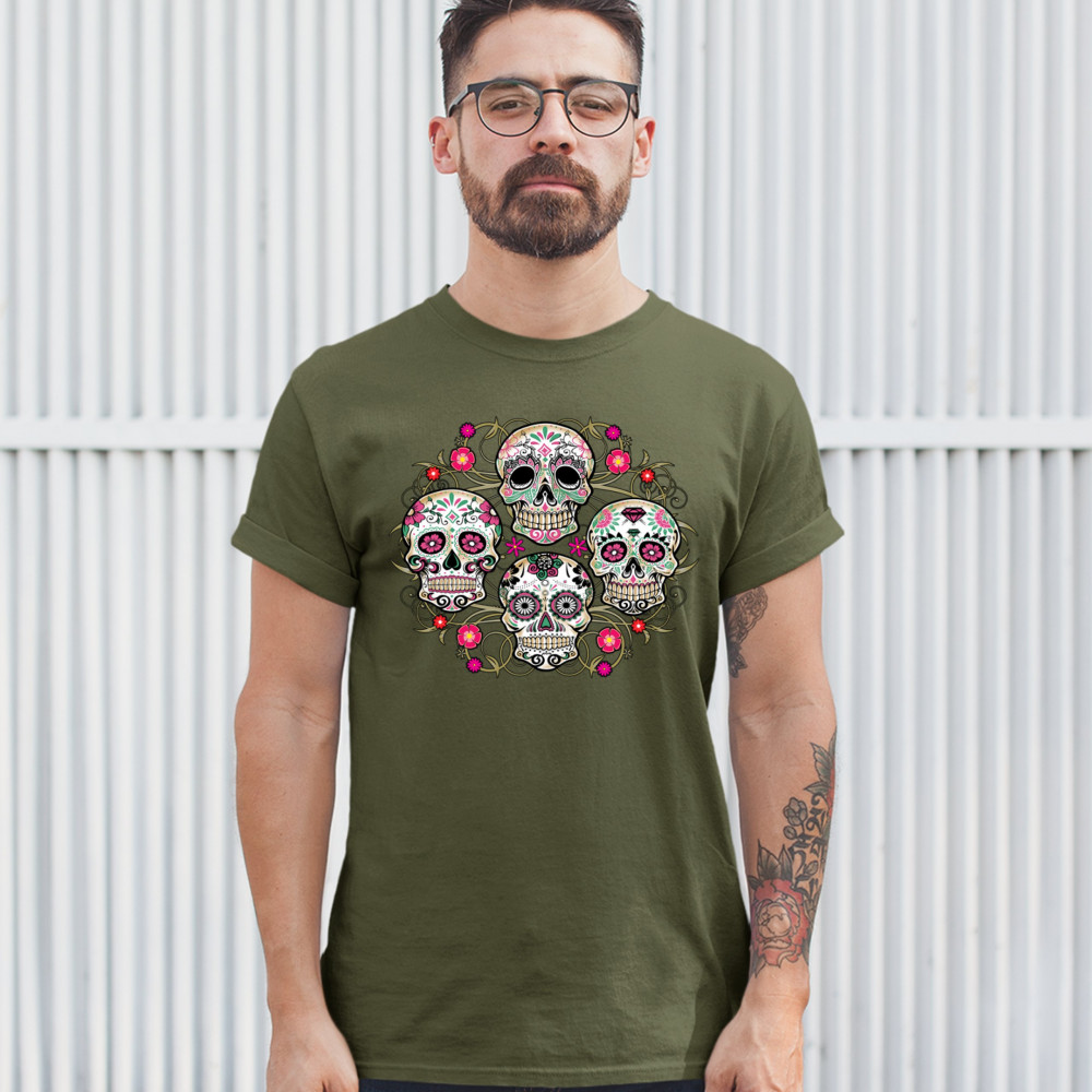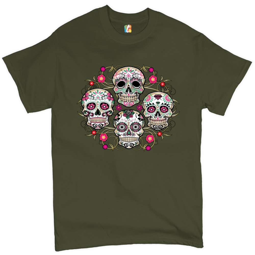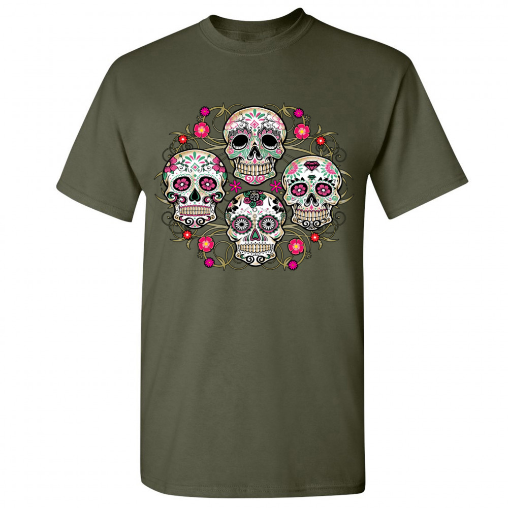 DAY OF THE DEAD FLORAL SUGAR SKULLS t-shirt dia de los muertos men's tee military green