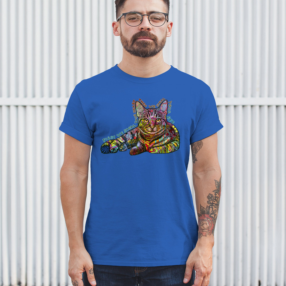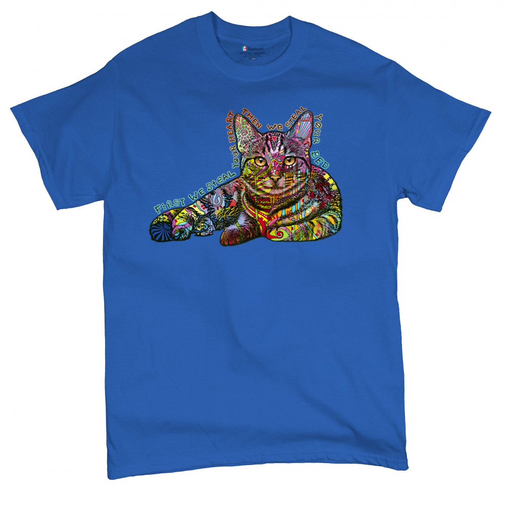 DEAN RUSSO CUTE NEON CAT t-shirt first we steal your heart kitten men's tee royal blue