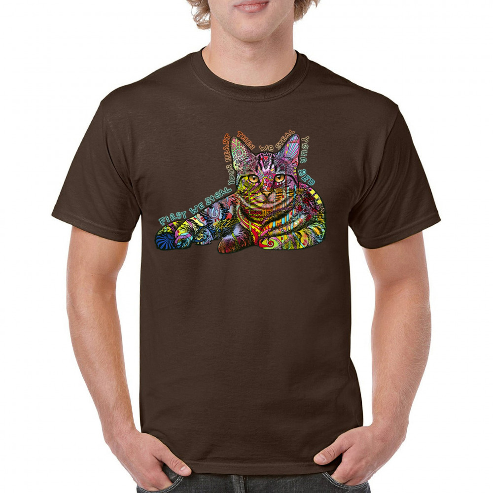 DEAN RUSSO CUTE NEON CAT t-shirt first we steal your heart kitten men's tee brown