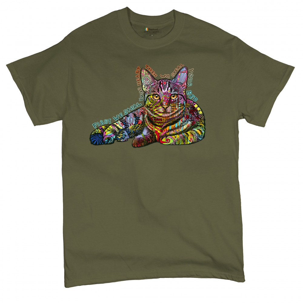 DEAN RUSSO CUTE NEON CAT t-shirt first we steal your heart kitten men's tee military green