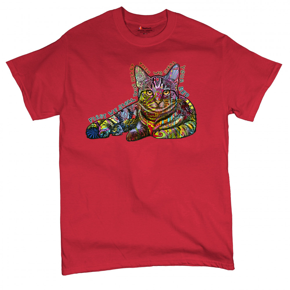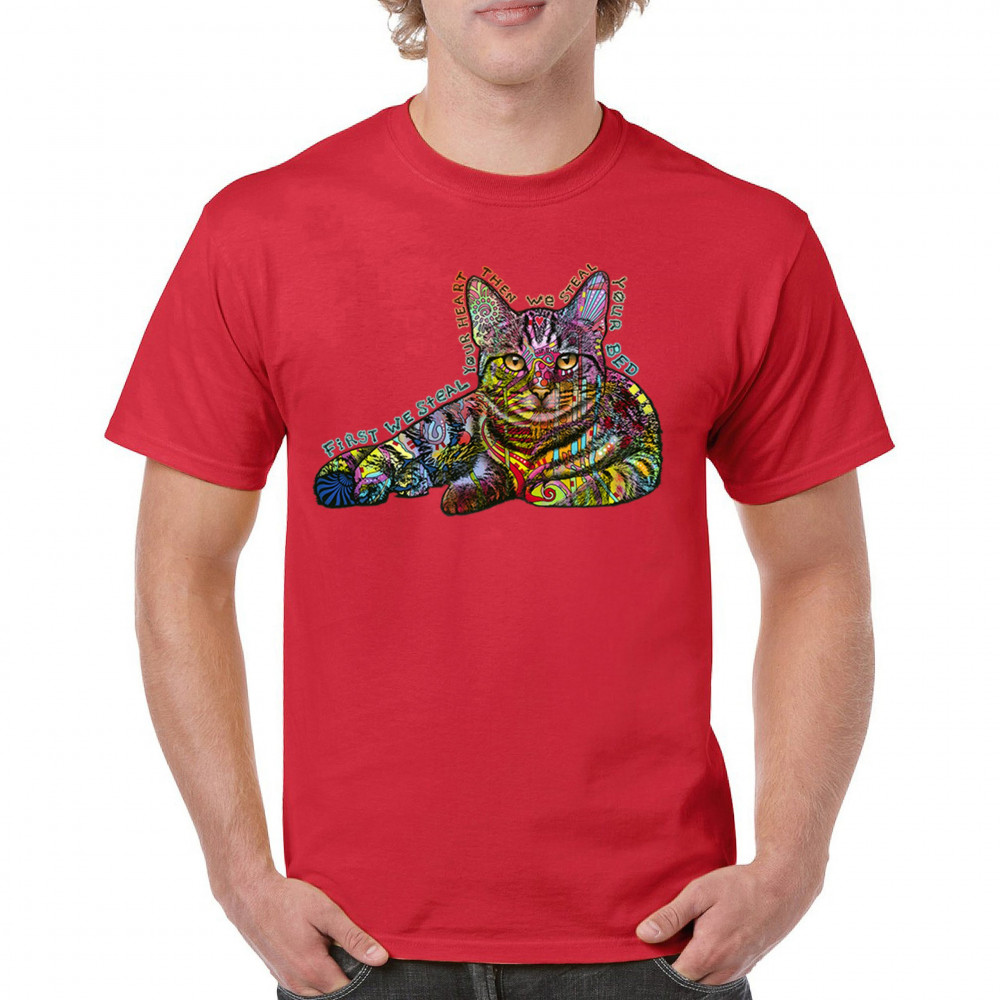 DEAN RUSSO CUTE NEON CAT t-shirt first we steal your heart kitten men's tee red