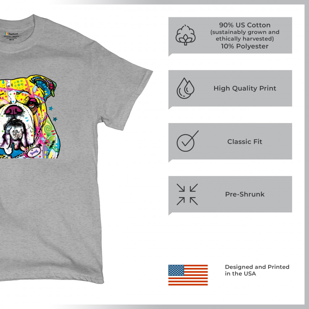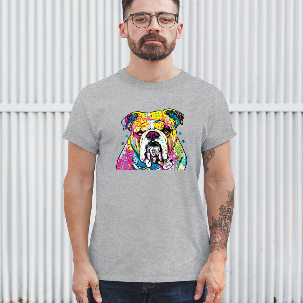 DEAN RUSSO SERIOUS BULLDOG t-shirt colorful dog best friend men's tee gray