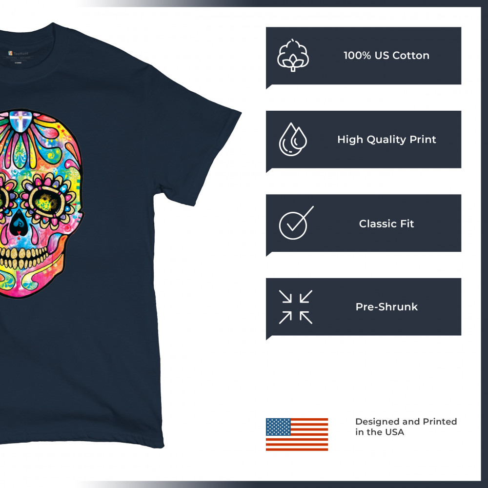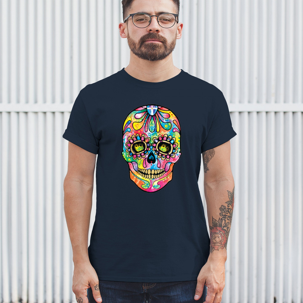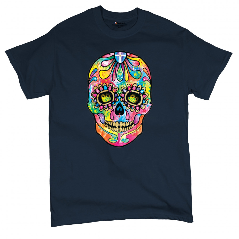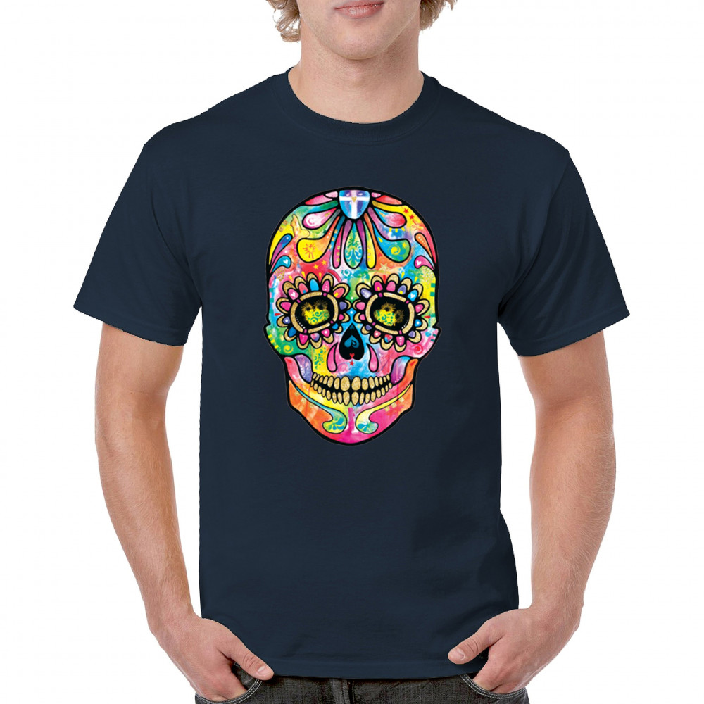 DEAN RUSSO SUGAR SKULL t-shirt day of the dead neon calavera men's tee navy blue