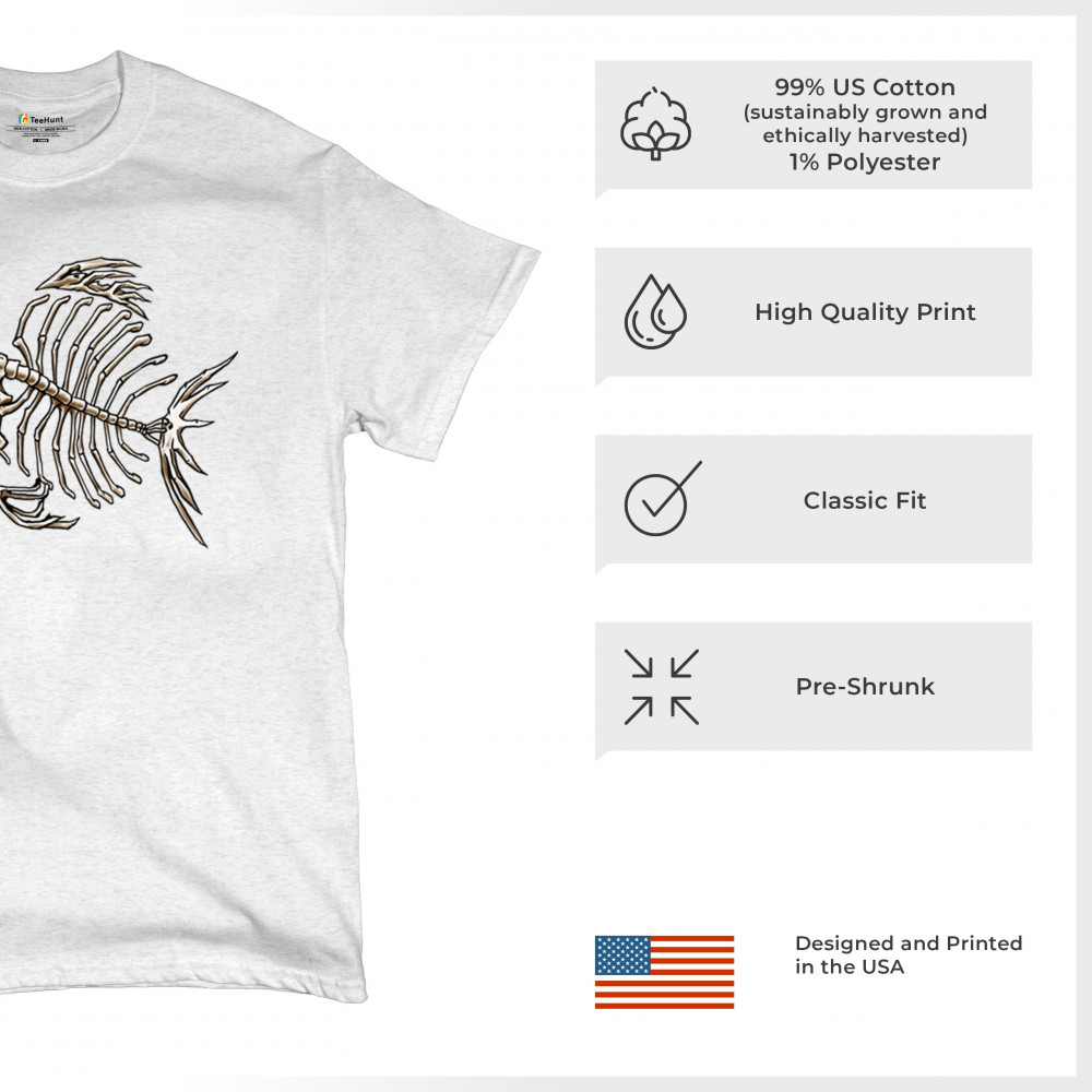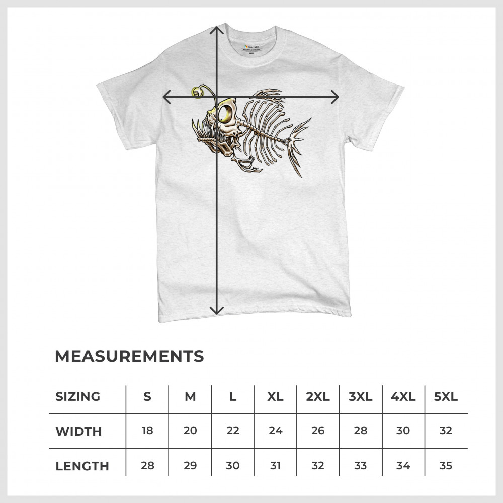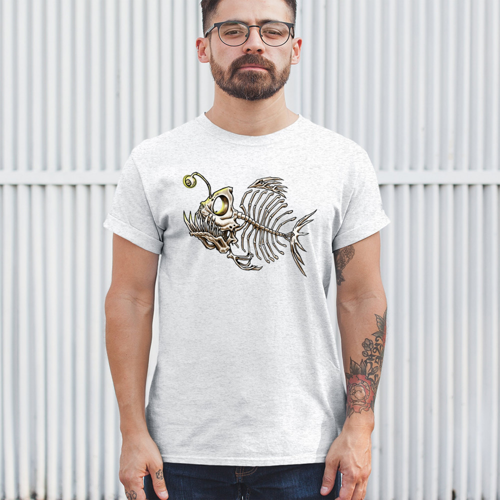 This highly detailed angler fish skeleton design features sharp bones, glowing lure eye, and deep sea terror aesthetic. Perfect for horror fans, marine biology lovers, and ocean adventurers, it combines underwater predator vibes with bone art flair. A great fit for Halloween, dive clubs, and dark sea aesthetics.