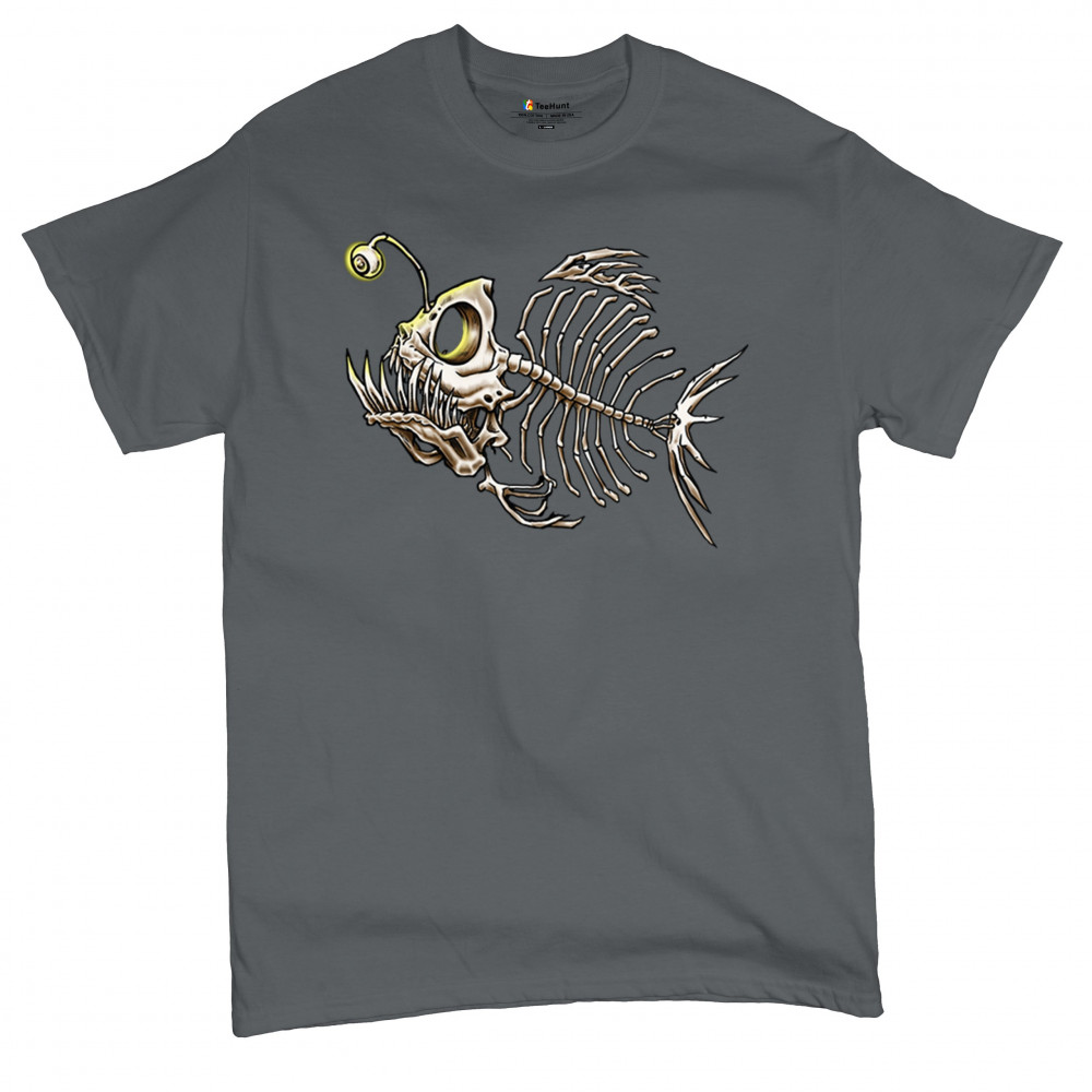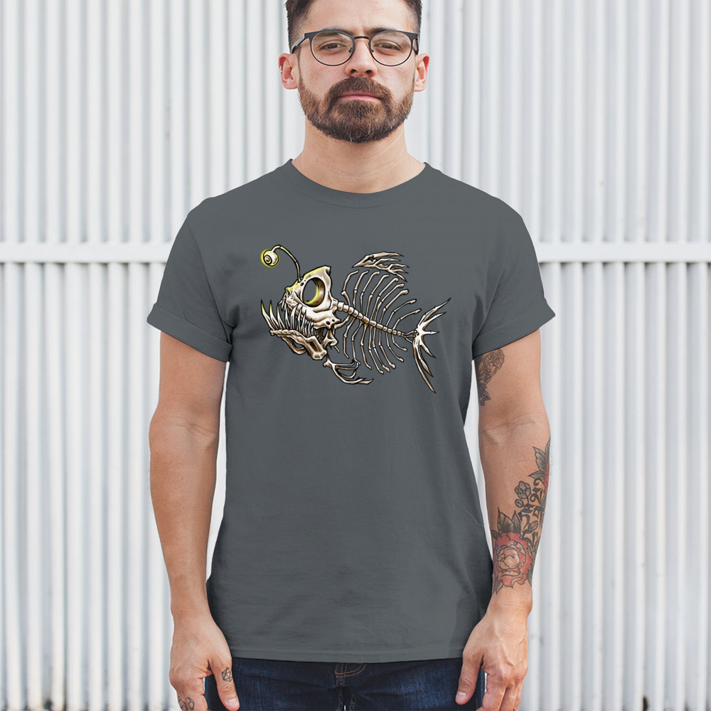 Creepy angler fish skeleton with glowing eye and horror bones. Perfect for sea lovers, divers, Halloween, and marine biology fans.
