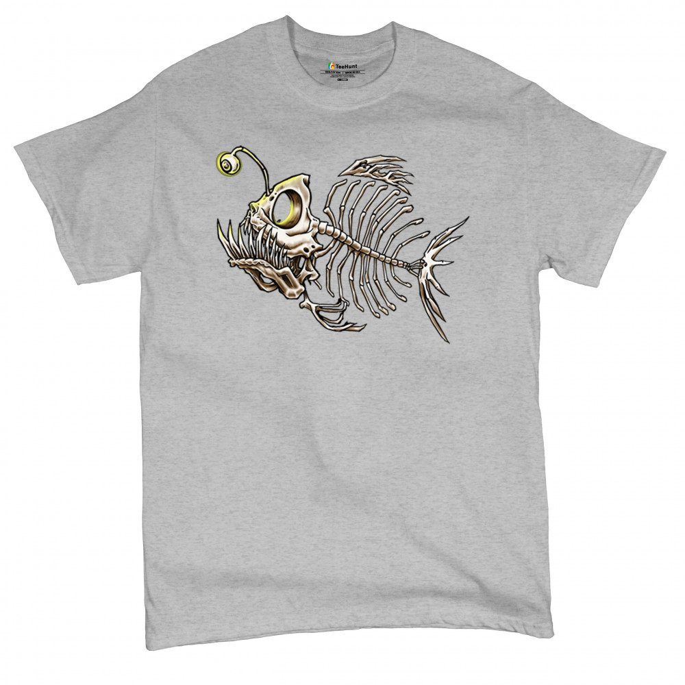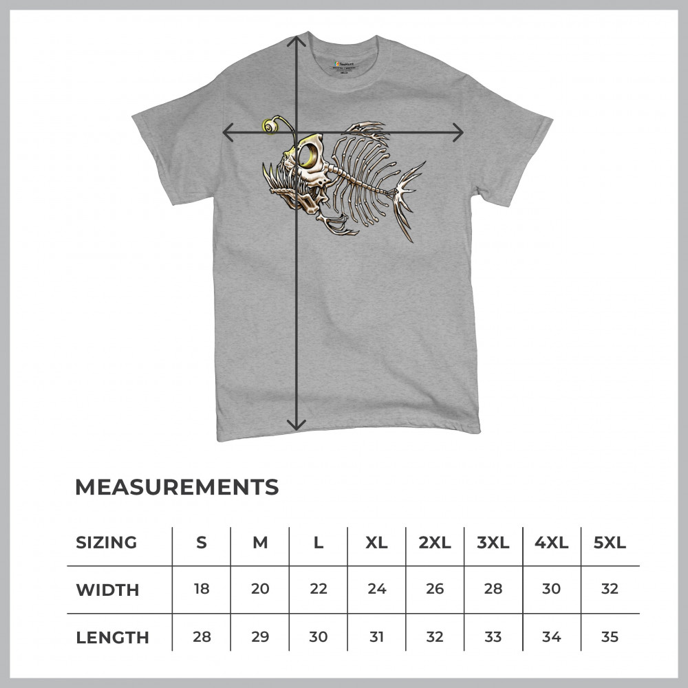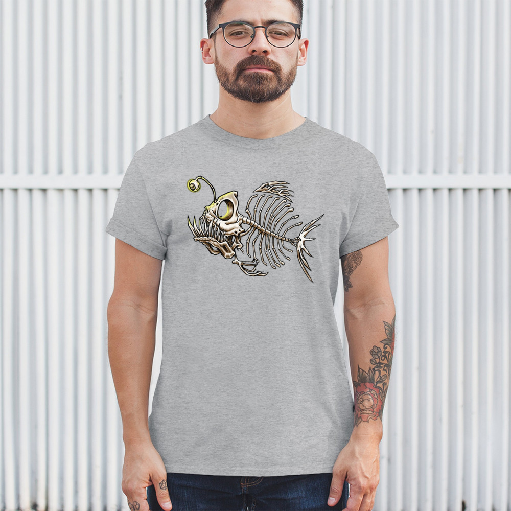 This highly detailed angler fish skeleton design features sharp bones, glowing lure eye, and deep sea terror aesthetic. Perfect for horror fans, marine biology lovers, and ocean adventurers, it combines underwater predator vibes with bone art flair. A great fit for Halloween, dive clubs, and dark sea aesthetics.