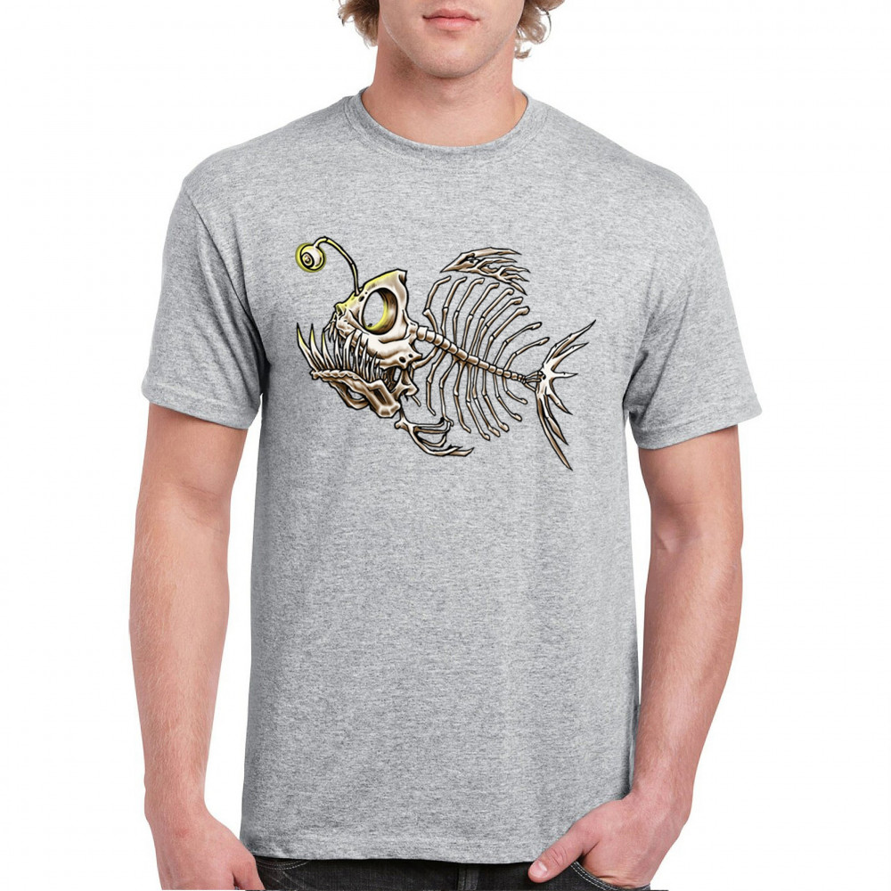 Creepy angler fish skeleton with glowing eye and horror bones. Perfect for sea lovers, divers, Halloween, and marine biology fans.