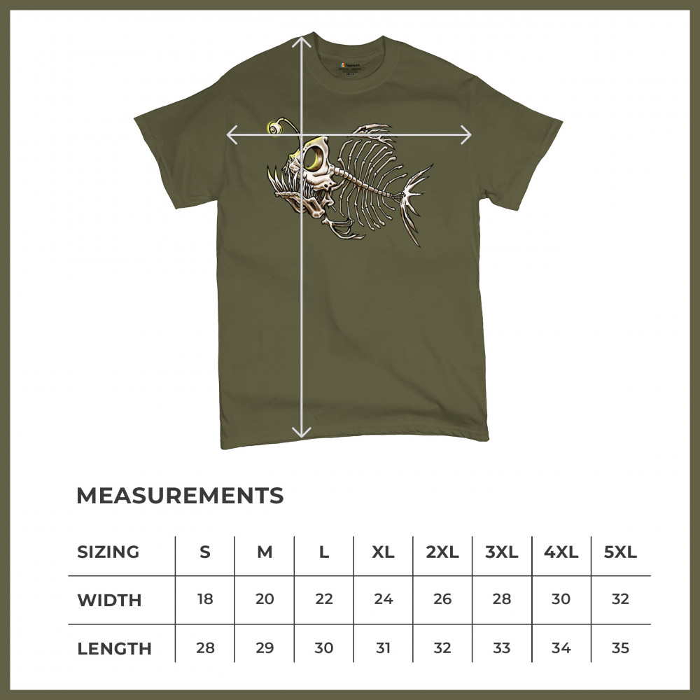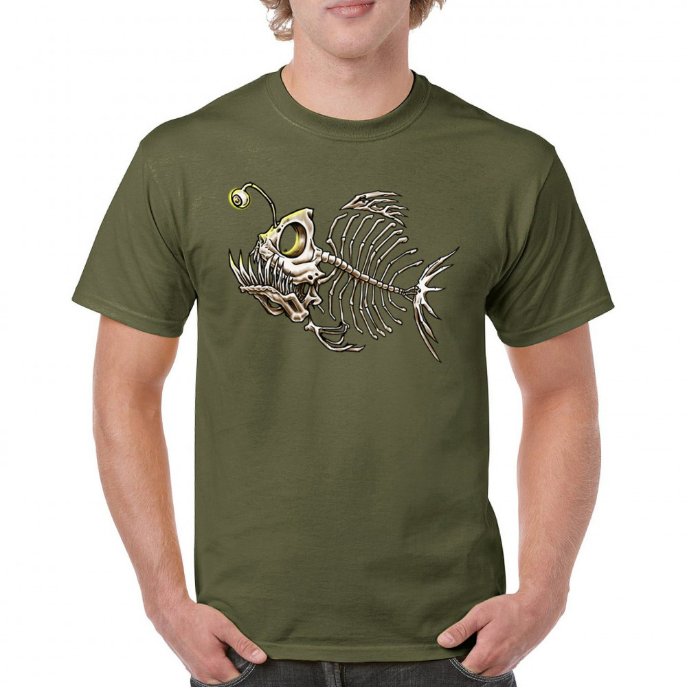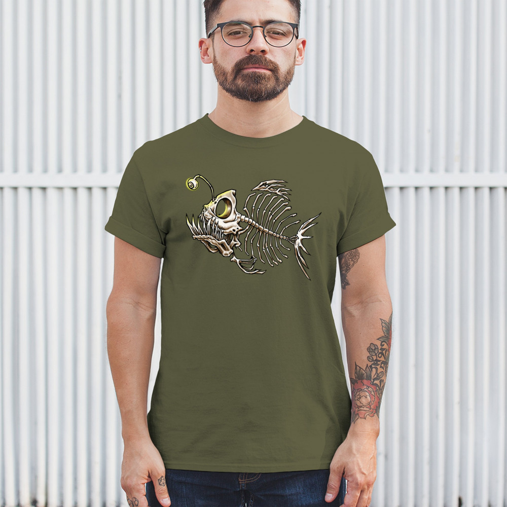 This highly detailed angler fish skeleton design features sharp bones, glowing lure eye, and deep sea terror aesthetic. Perfect for horror fans, marine biology lovers, and ocean adventurers, it combines underwater predator vibes with bone art flair. A great fit for Halloween, dive clubs, and dark sea aesthetics.