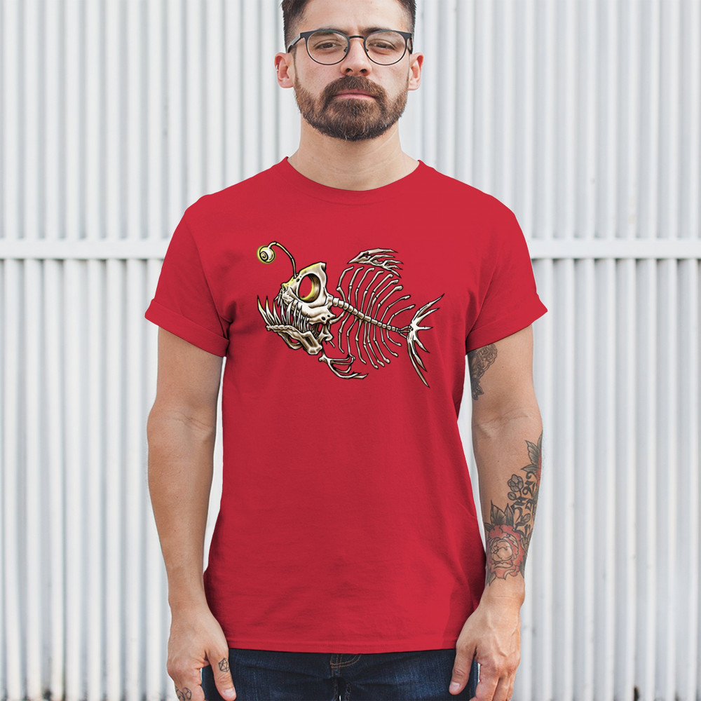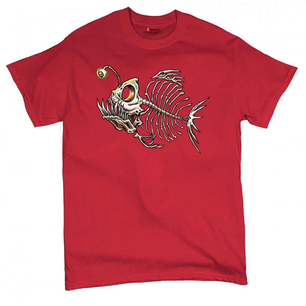 This highly detailed angler fish skeleton design features sharp bones, glowing lure eye, and deep sea terror aesthetic. Perfect for horror fans, marine biology lovers, and ocean adventurers, it combines underwater predator vibes with bone art flair. A great fit for Halloween, dive clubs, and dark sea aesthetics.