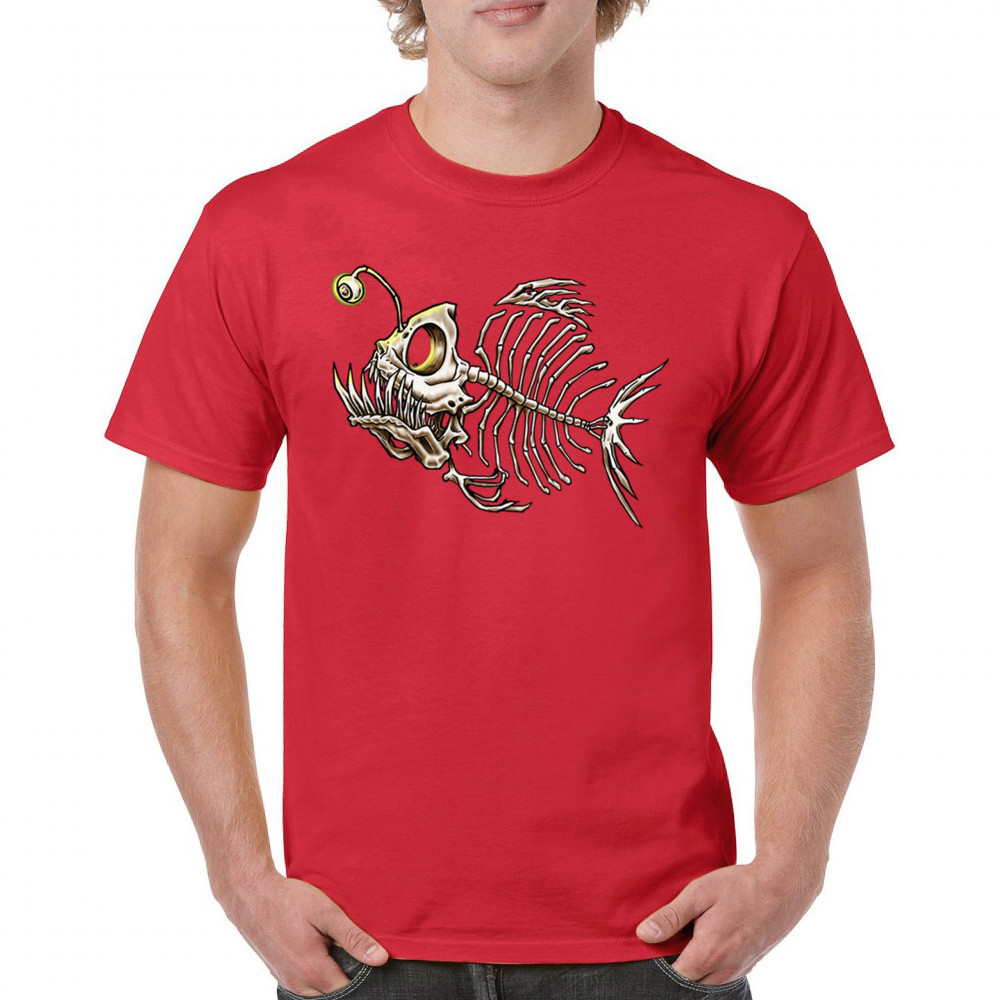 Creepy angler fish skeleton with glowing eye and horror bones. Perfect for sea lovers, divers, Halloween, and marine biology fans.
