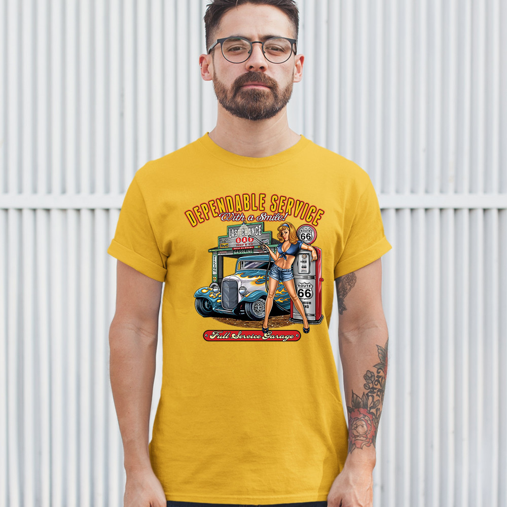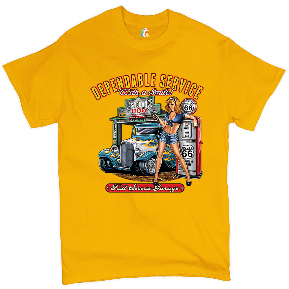 A print featuring a sexy pin-up girl standing by a gas pump with Route 66 signs on it. Behind her there is a garage with a hot rod parked at it. The print says: "Dependable Service With a Smile!" at the top and "Full Service Garage" at the bottom. A great