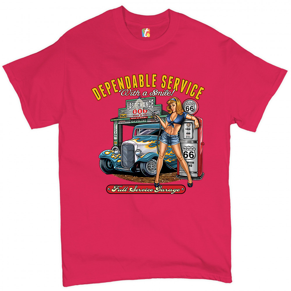 A print featuring a sexy pin-up girl standing by a gas pump with Route 66 signs on it. Behind her there is a garage with a hot rod parked at it. The print says: "Dependable Service With a Smile!" at the top and "Full Service Garage" at the bottom. A great