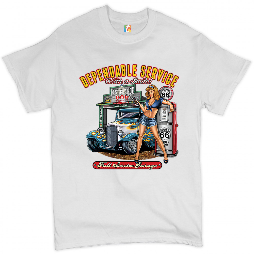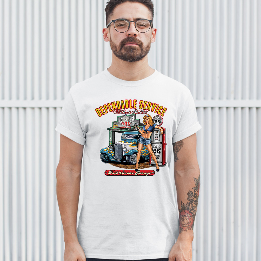 A print featuring a sexy pin-up girl standing by a gas pump with Route 66 signs on it. Behind her there is a garage with a hot rod parked at it. The print says: "Dependable Service With a Smile!" at the top and "Full Service Garage" at the bottom. A great