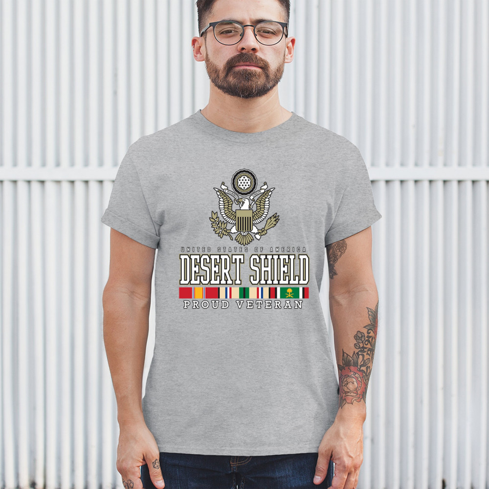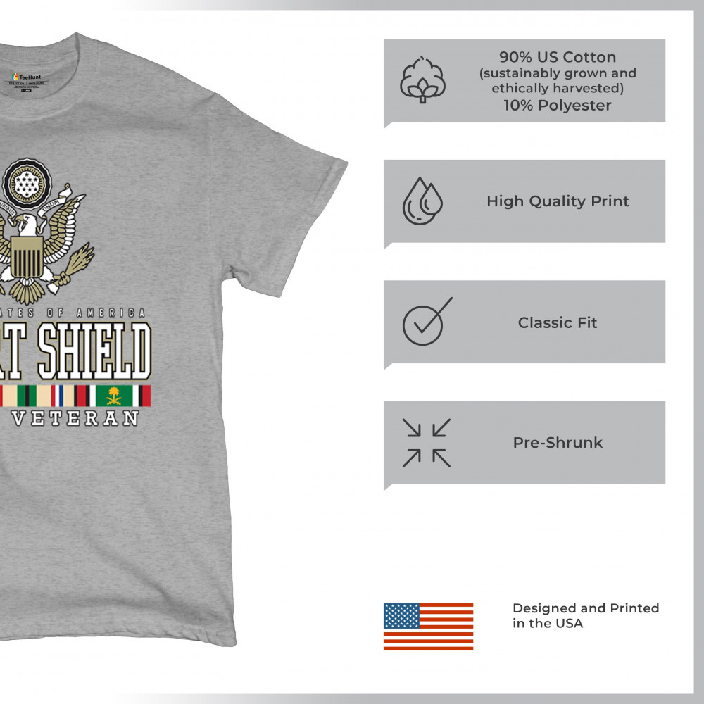 Wear your service with honor with our Desert Shield veteran design, a tribute to the valorous U.S. Army soldiers who stand for freedom, duty, and resilience.