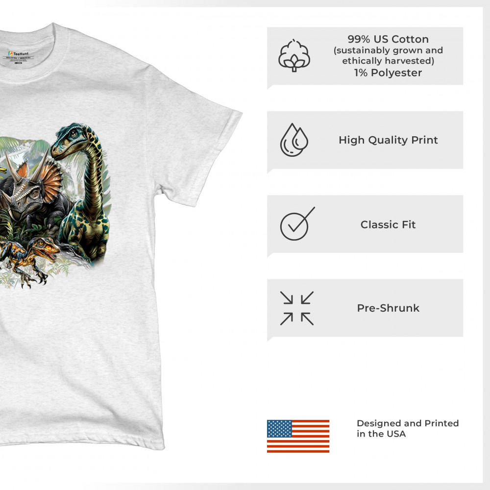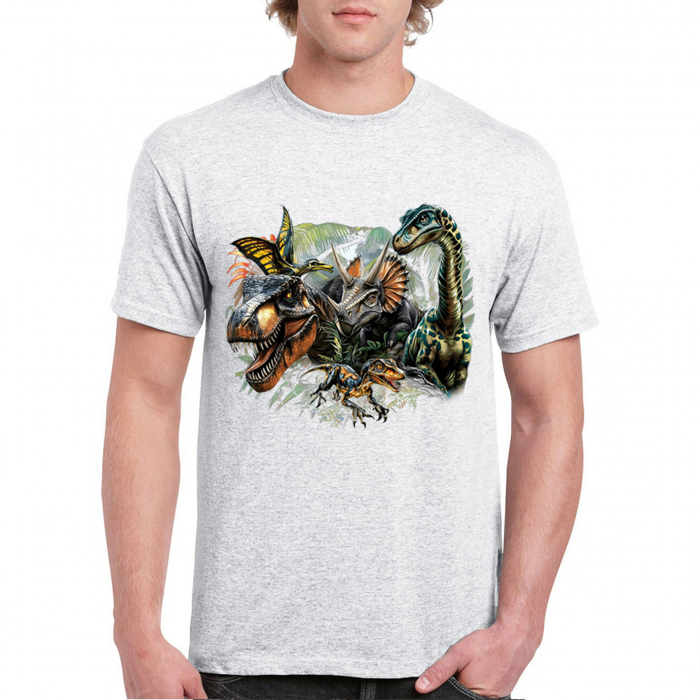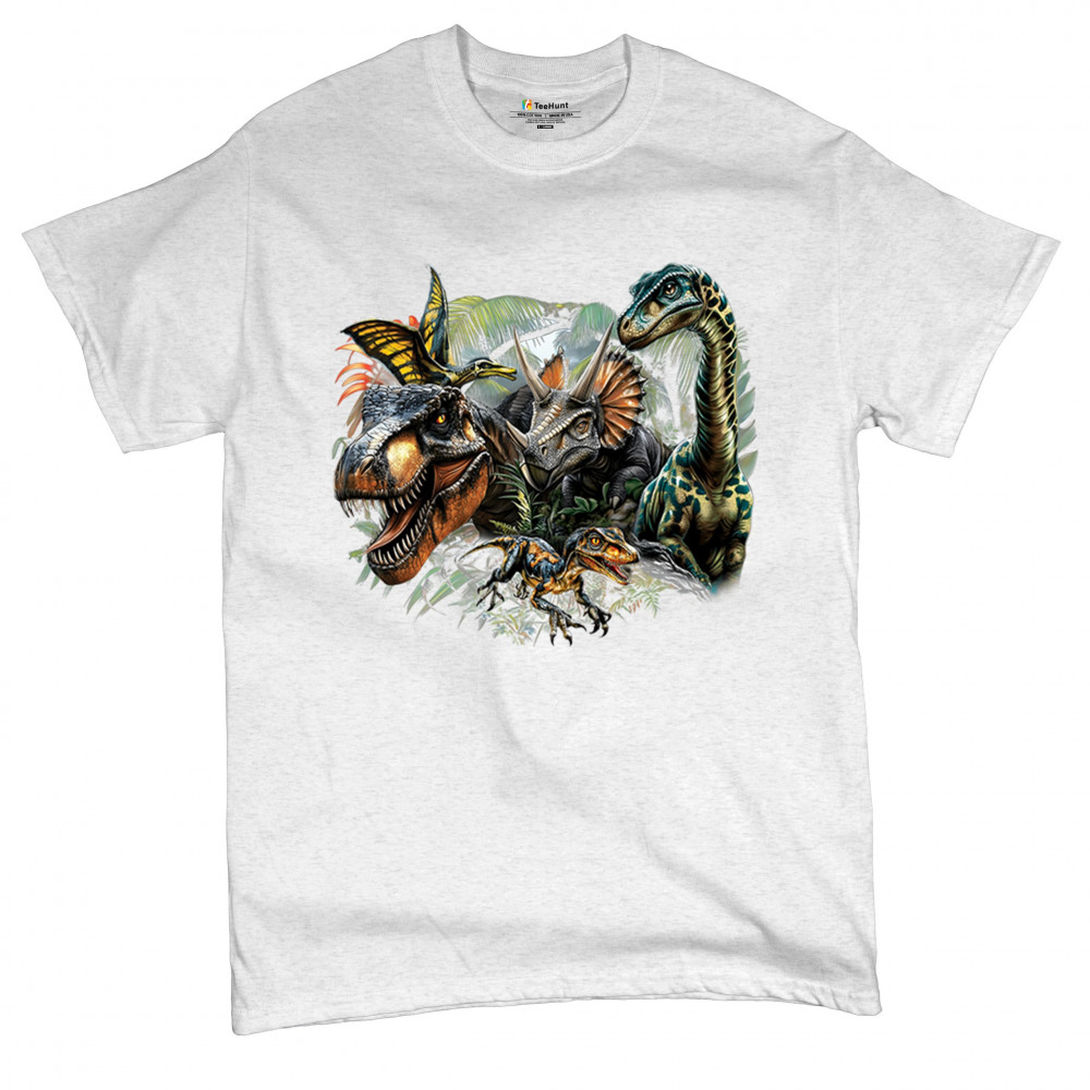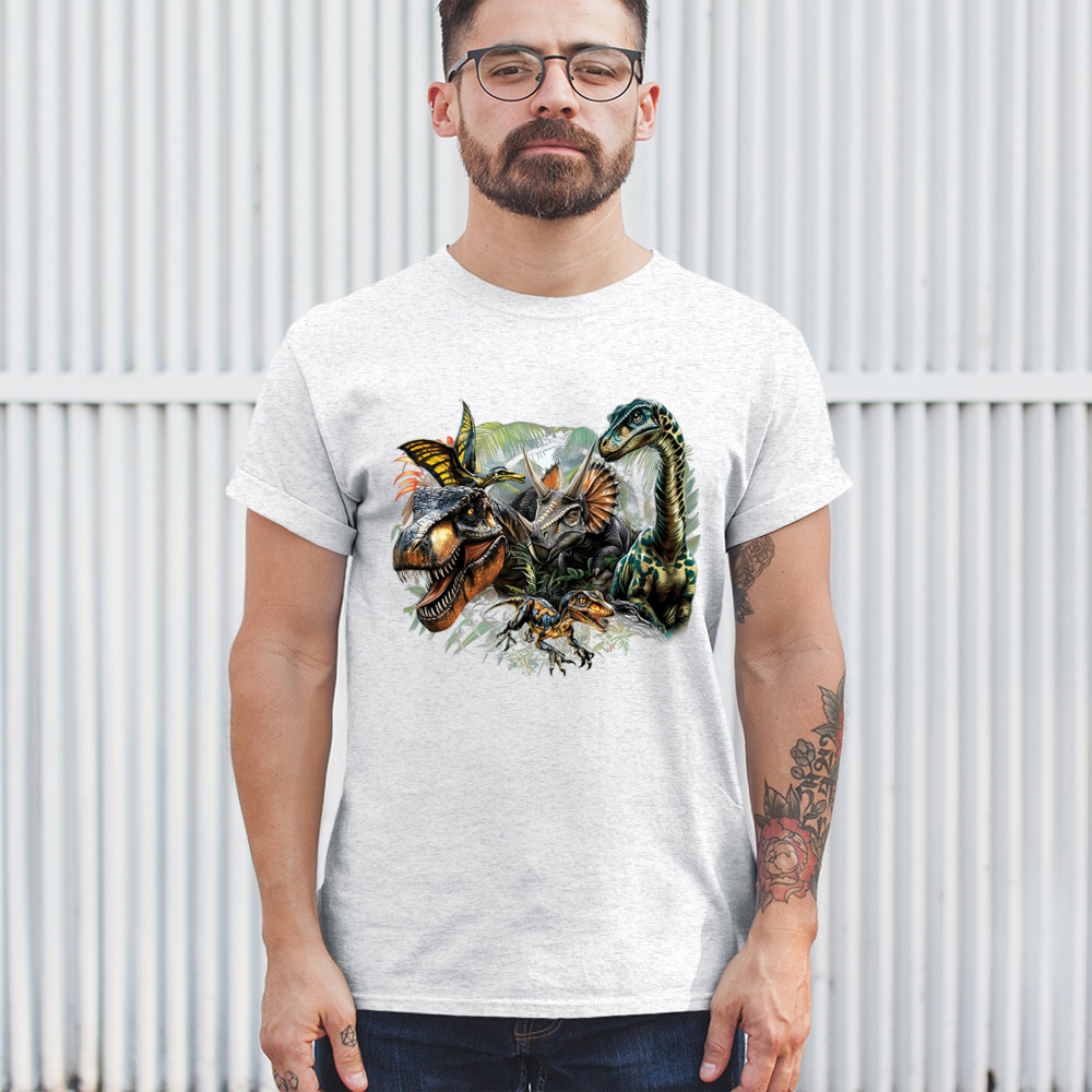 Get prehistoric with this electrifying design featuring a full dino squad in vibrant jungle detail. Includes t rex, triceratops, raptor, brachiosaurus, and pteranodon, all surrounded by tropical foliage. A perfect pick for dinosaur fans, fossil hunters, Jurassic birthday parties, or anyone who loves bold, wild, nature-themed art.