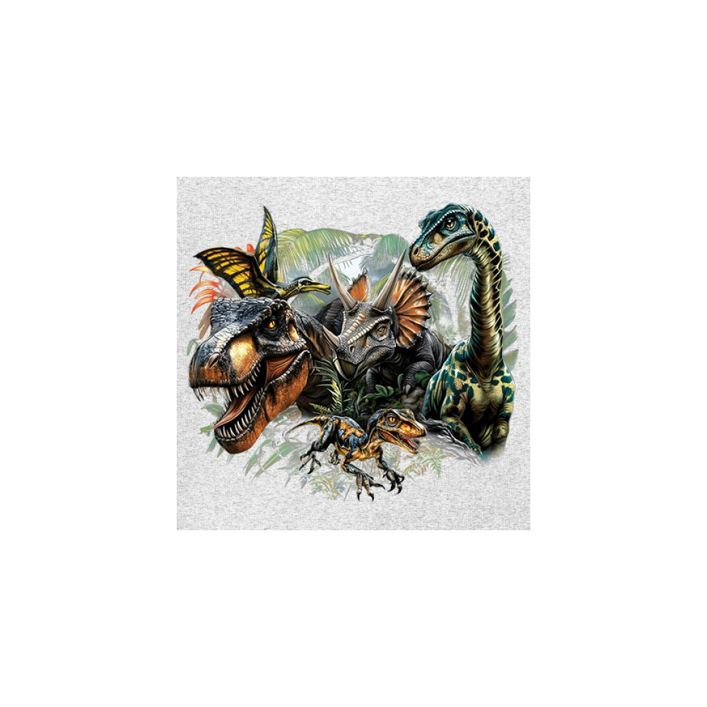 Bold jungle dinosaur design featuring t rex, triceratops, raptor, brachiosaurus, and pteranodon. Perfect for parties, digs, and dino fans.