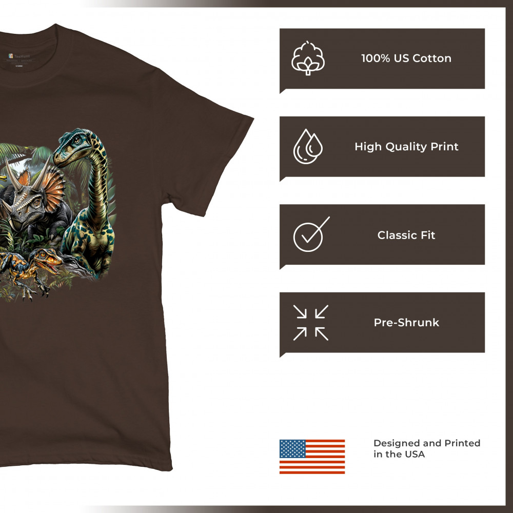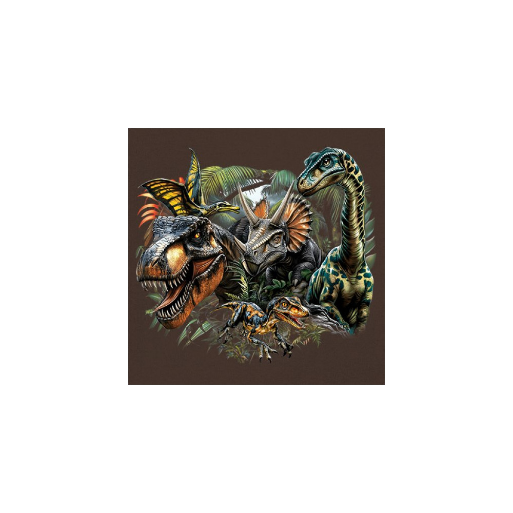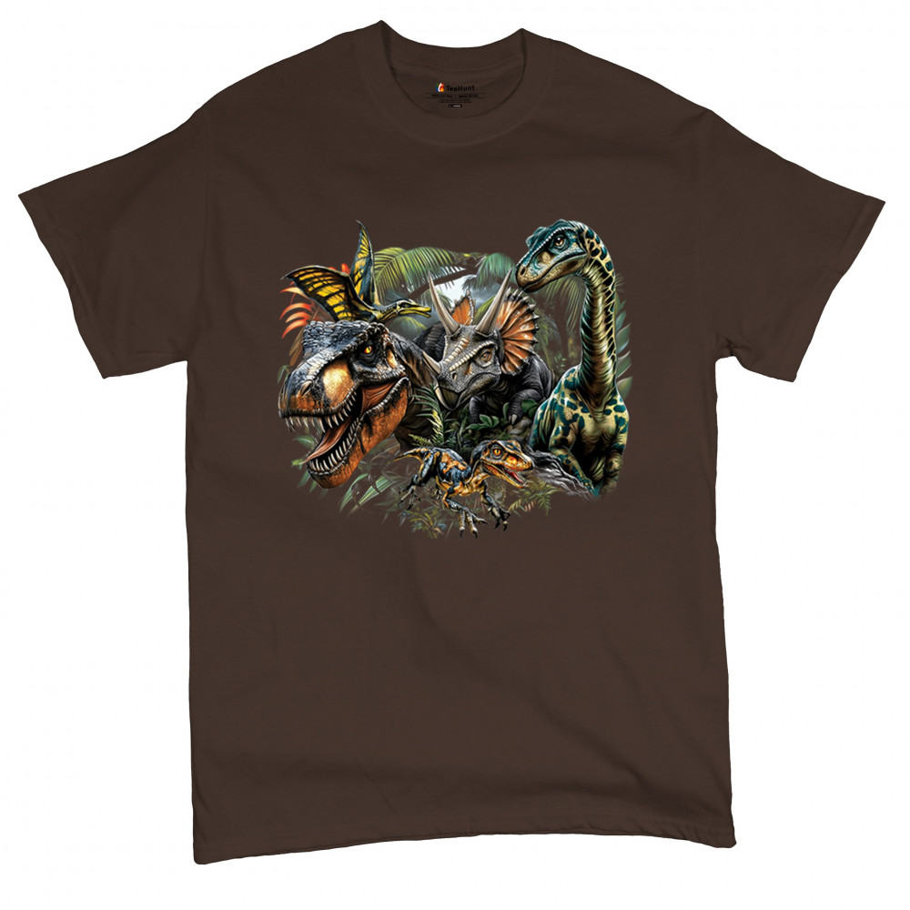 Get prehistoric with this electrifying design featuring a full dino squad in vibrant jungle detail. Includes t rex, triceratops, raptor, brachiosaurus, and pteranodon, all surrounded by tropical foliage. A perfect pick for dinosaur fans, fossil hunters, Jurassic birthday parties, or anyone who loves bold, wild, nature-themed art.