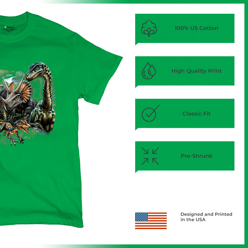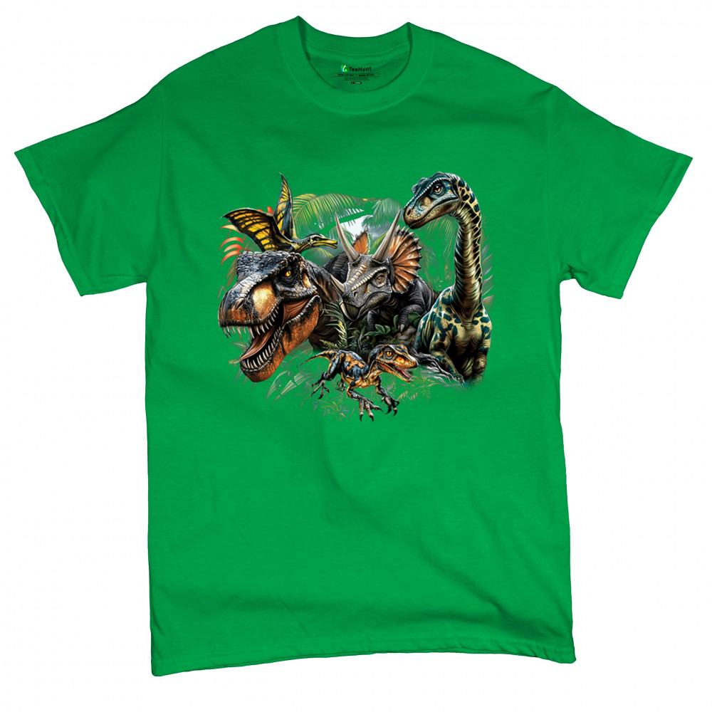 Get prehistoric with this electrifying design featuring a full dino squad in vibrant jungle detail. Includes t rex, triceratops, raptor, brachiosaurus, and pteranodon, all surrounded by tropical foliage. A perfect pick for dinosaur fans, fossil hunters, Jurassic birthday parties, or anyone who loves bold, wild, nature-themed art.