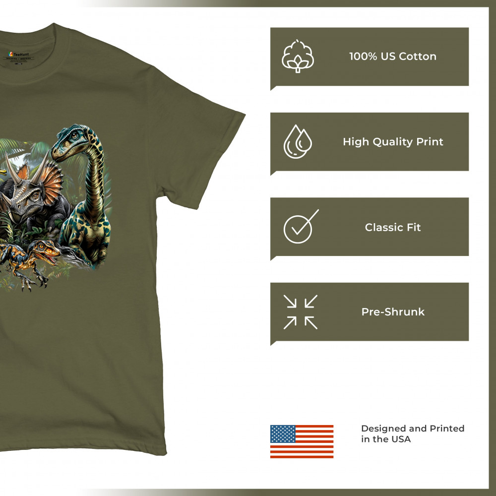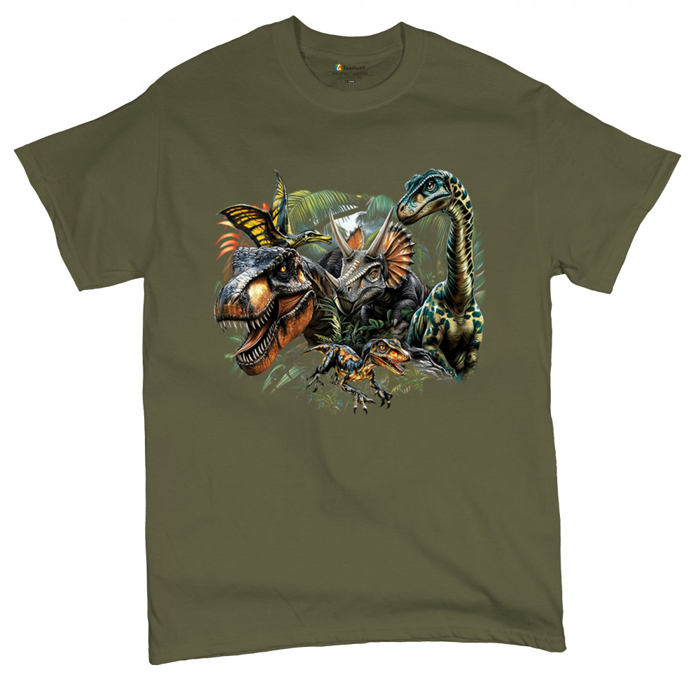 Bold jungle dinosaur design featuring t rex, triceratops, raptor, brachiosaurus, and pteranodon. Perfect for parties, digs, and dino fans.