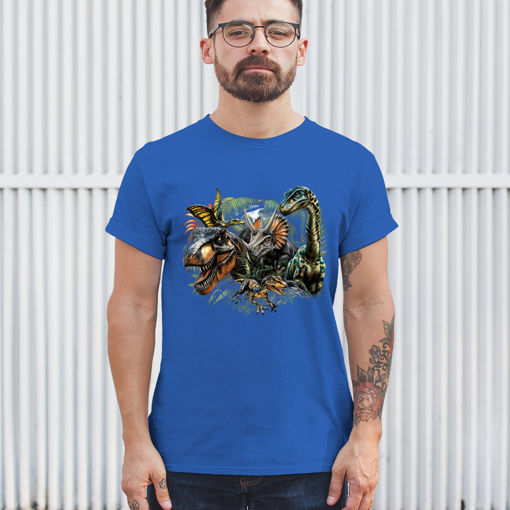 Get prehistoric with this electrifying design featuring a full dino squad in vibrant jungle detail. Includes t rex, triceratops, raptor, brachiosaurus, and pteranodon, all surrounded by tropical foliage. A perfect pick for dinosaur fans, fossil hunters, Jurassic birthday parties, or anyone who loves bold, wild, nature-themed art.