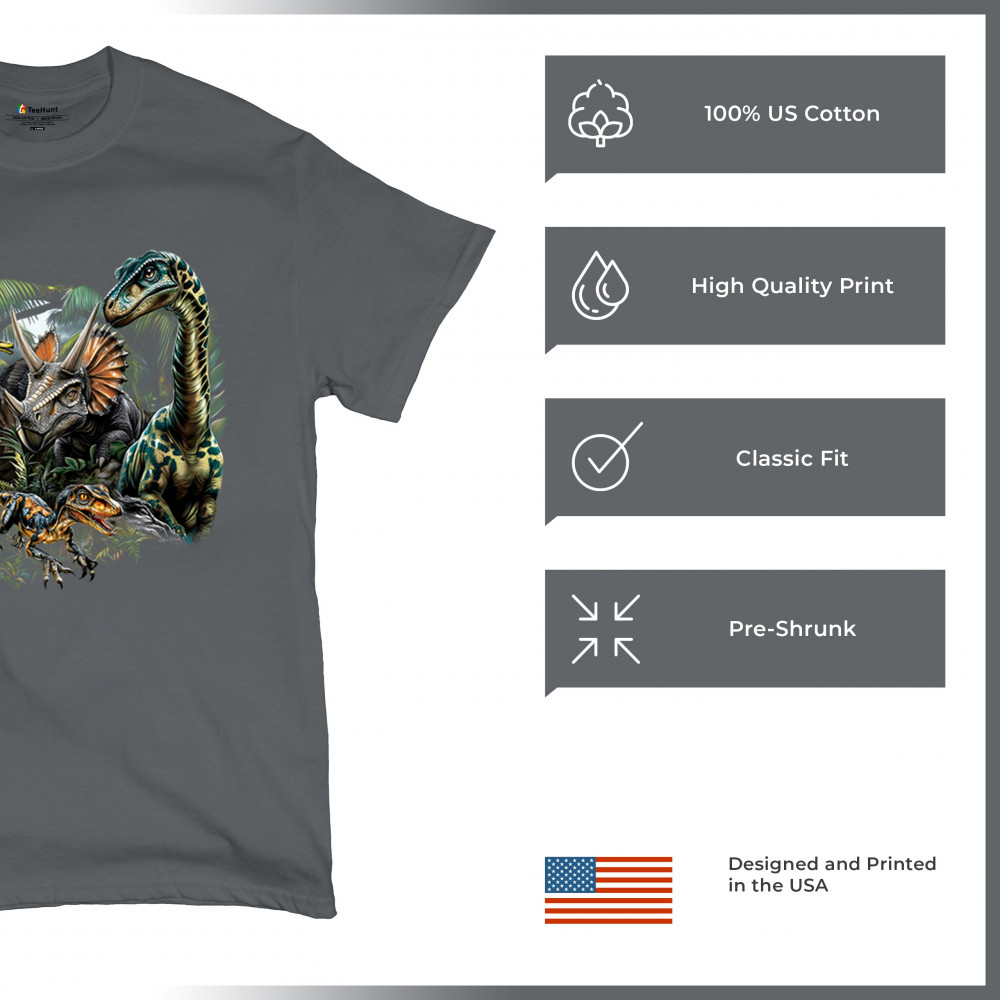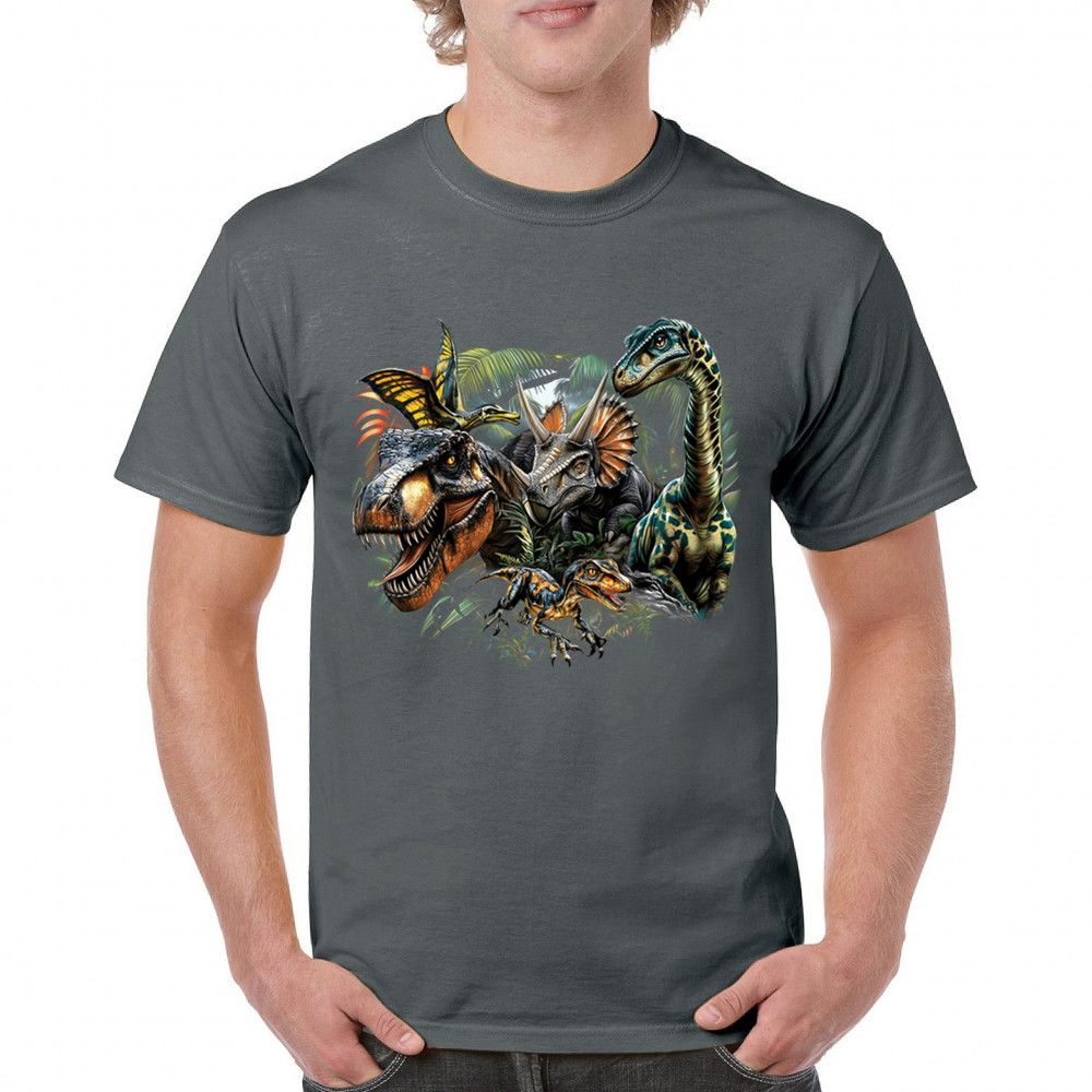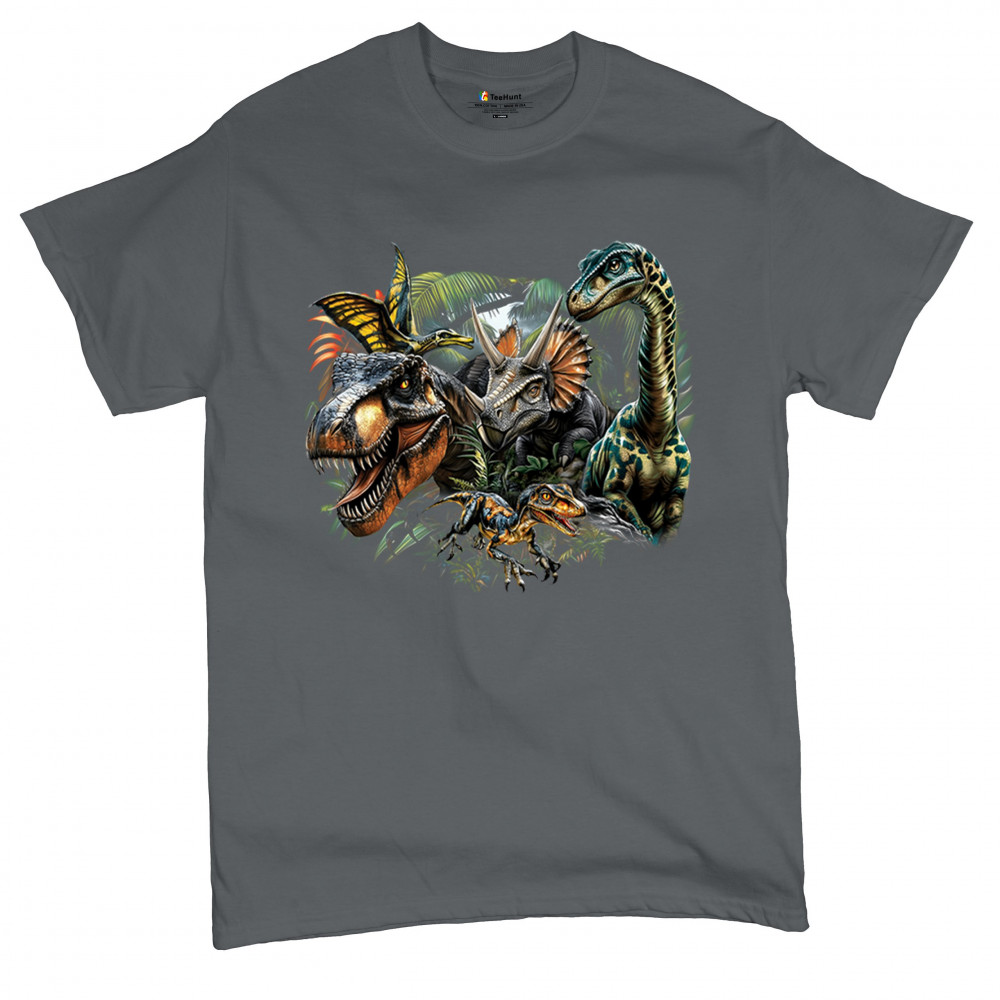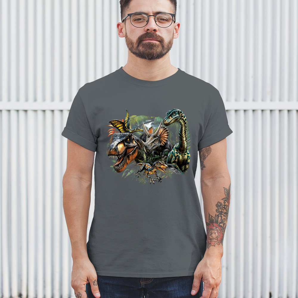 Get prehistoric with this electrifying design featuring a full dino squad in vibrant jungle detail. Includes t rex, triceratops, raptor, brachiosaurus, and pteranodon, all surrounded by tropical foliage. A perfect pick for dinosaur fans, fossil hunters, Jurassic birthday parties, or anyone who loves bold, wild, nature-themed art.