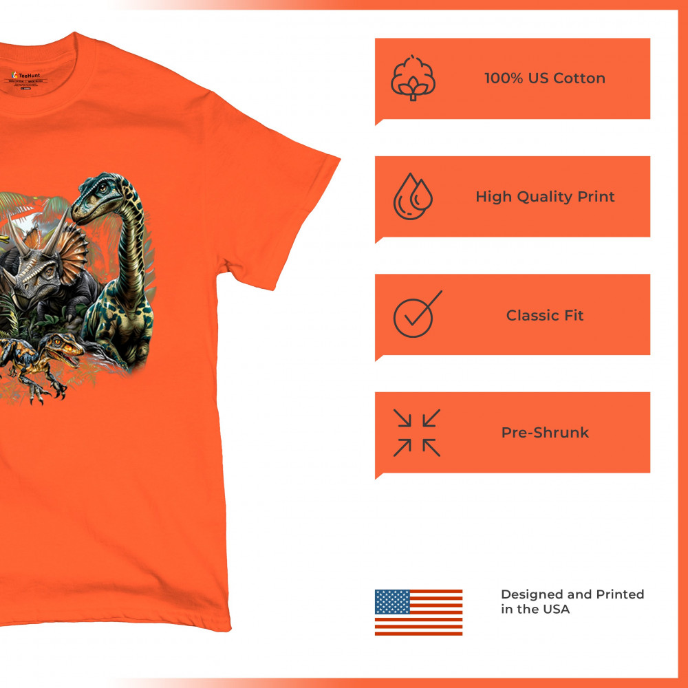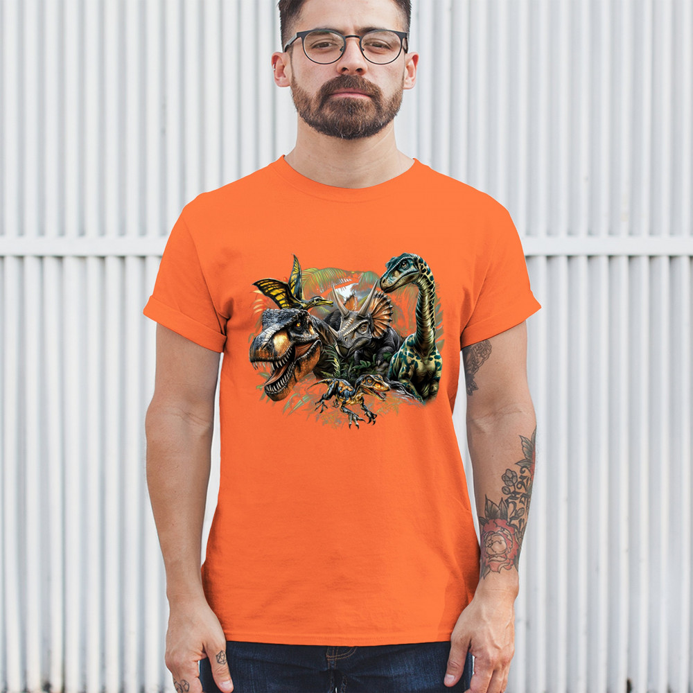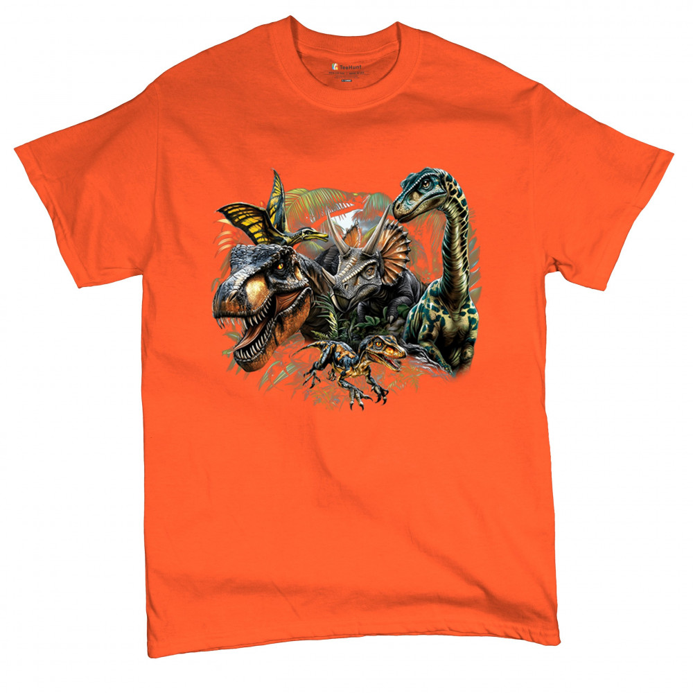 Get prehistoric with this electrifying design featuring a full dino squad in vibrant jungle detail. Includes t rex, triceratops, raptor, brachiosaurus, and pteranodon, all surrounded by tropical foliage. A perfect pick for dinosaur fans, fossil hunters, Jurassic birthday parties, or anyone who loves bold, wild, nature-themed art.