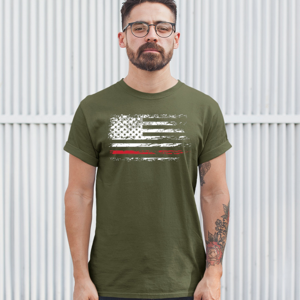 DISTRESSED AMERICAN FLAG t-shirt thind red line firefighter men's tee military green
