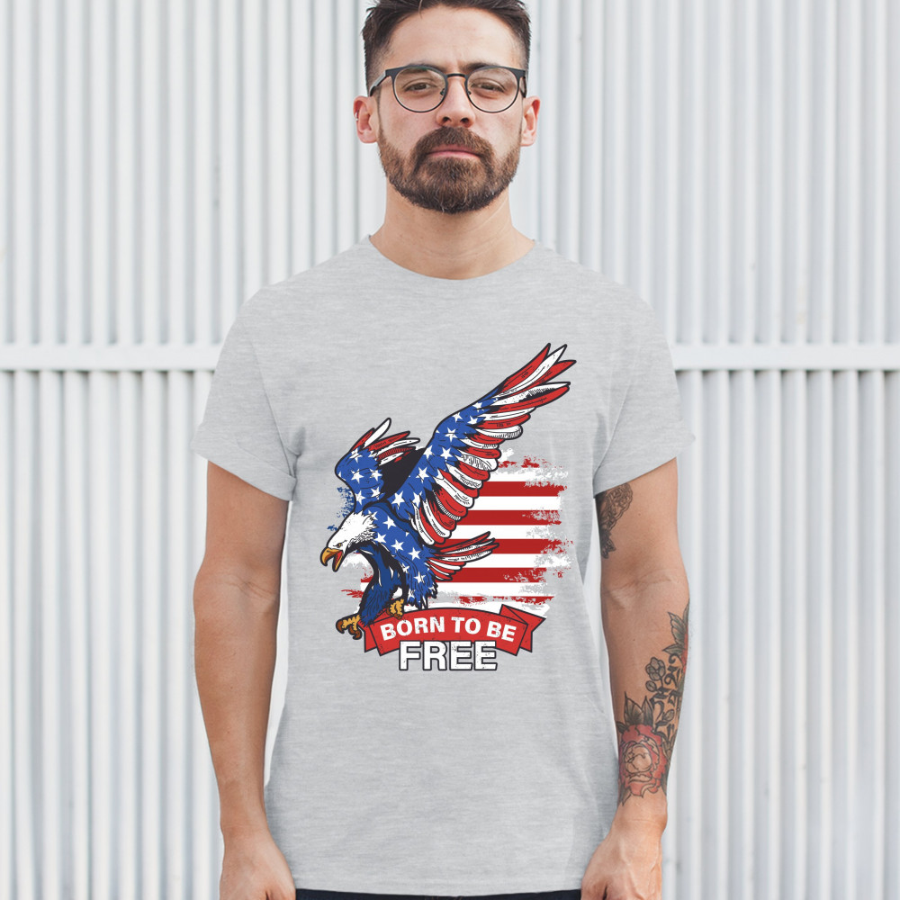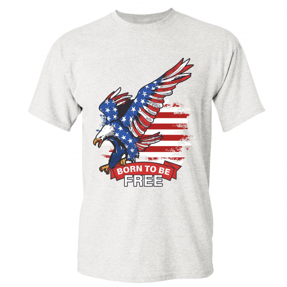 A patriotic print saying "Born to Be Free" and featuring a diving American Bald Eagle. In the background there is a distressed American Flag and the eagle is covered with Stars and Stripes. Great choice to wear on Independence Day or any other patriotic h