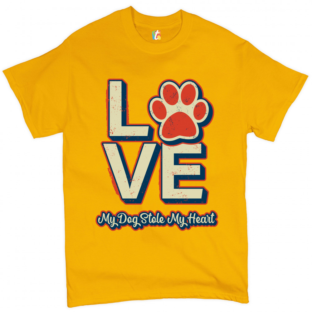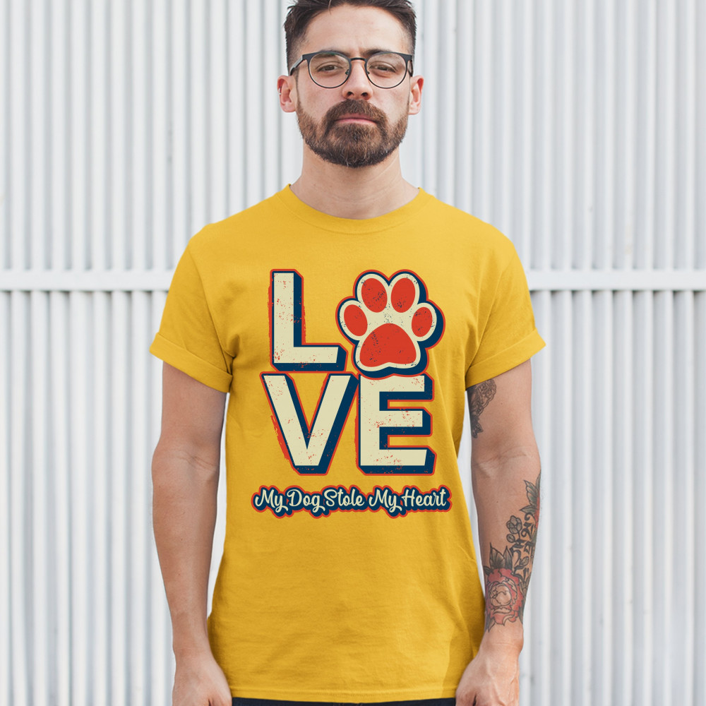 DOG PAW LOVE t-shirt my dog stole my heart pet owner animal lover men's tee yellow