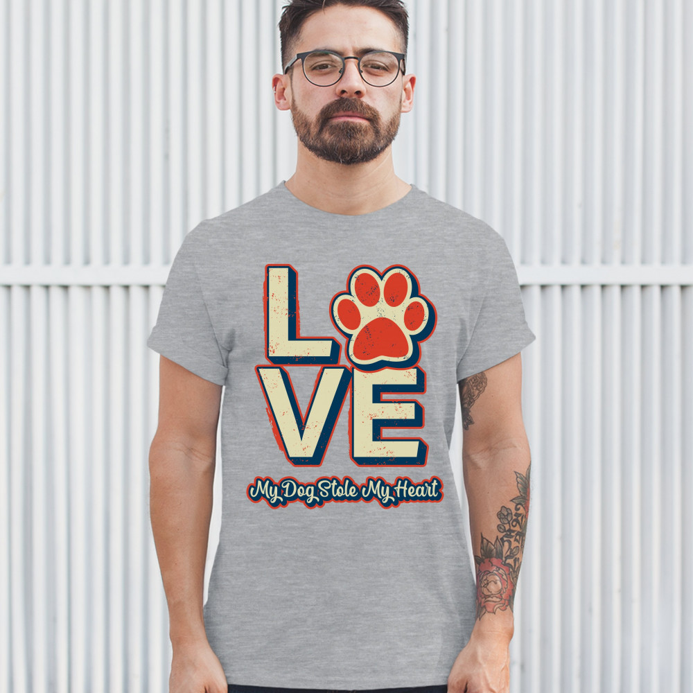 A sweet print featuring a word "Love" in which "o" is replaced with a paw. Underneath it says: "My Dog Stole My Heart". A great choice for any dog person.