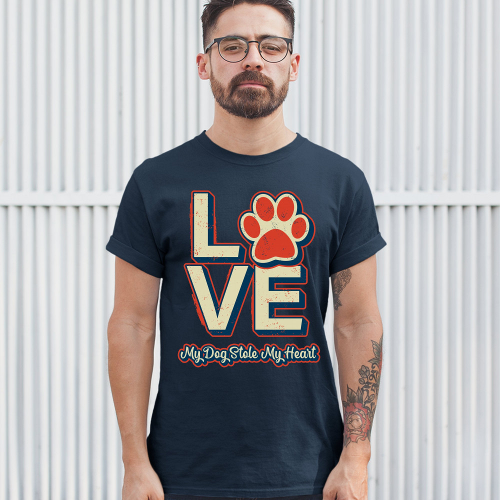 A sweet print featuring a word "Love" in which "o" is replaced with a paw. Underneath it says: "My Dog Stole My Heart". A great choice for any dog person.