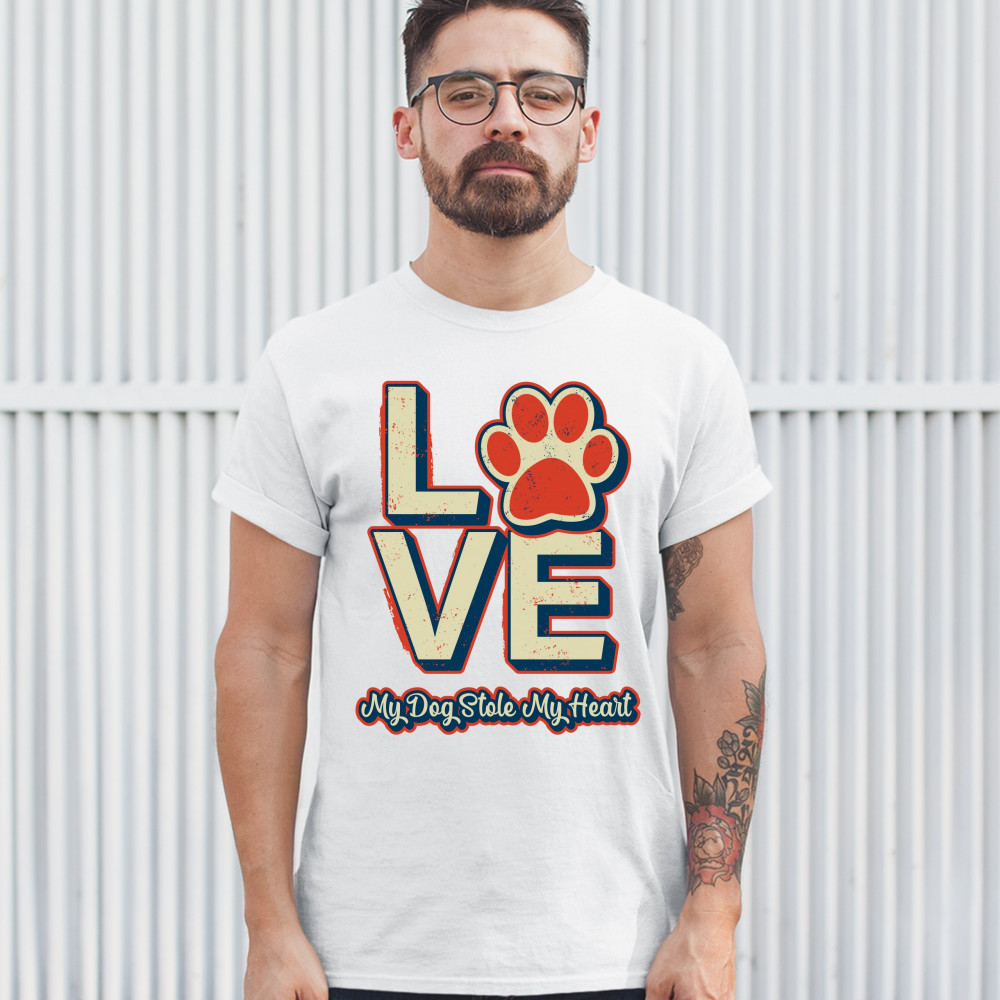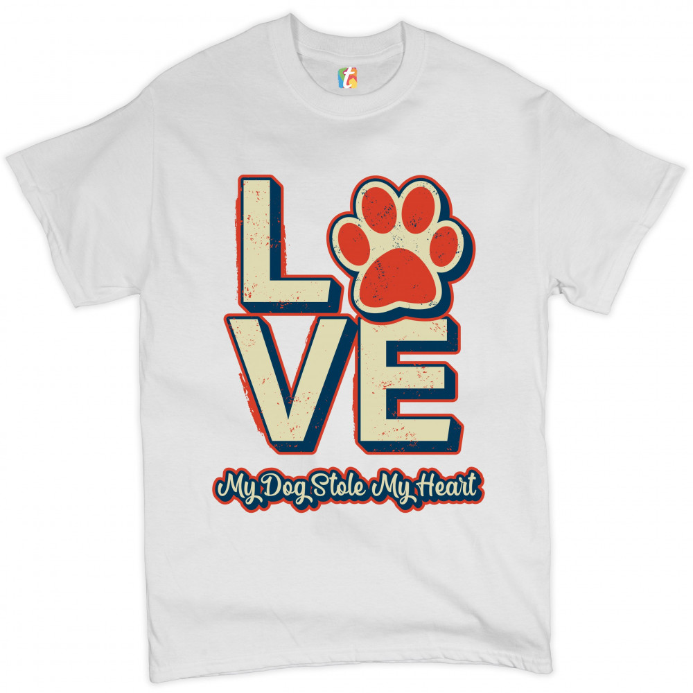 A sweet print featuring a word "Love" in which "o" is replaced with a paw. Underneath it says: "My Dog Stole My Heart". A great choice for any dog person.