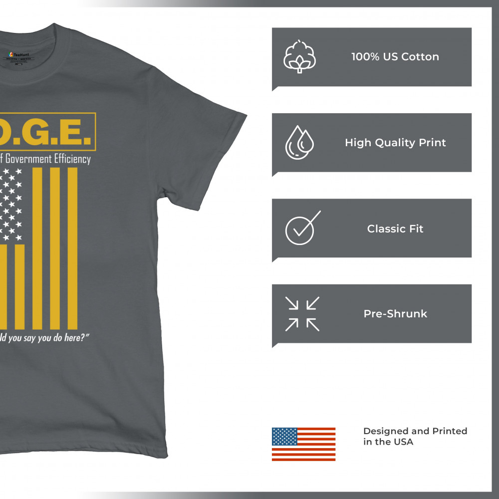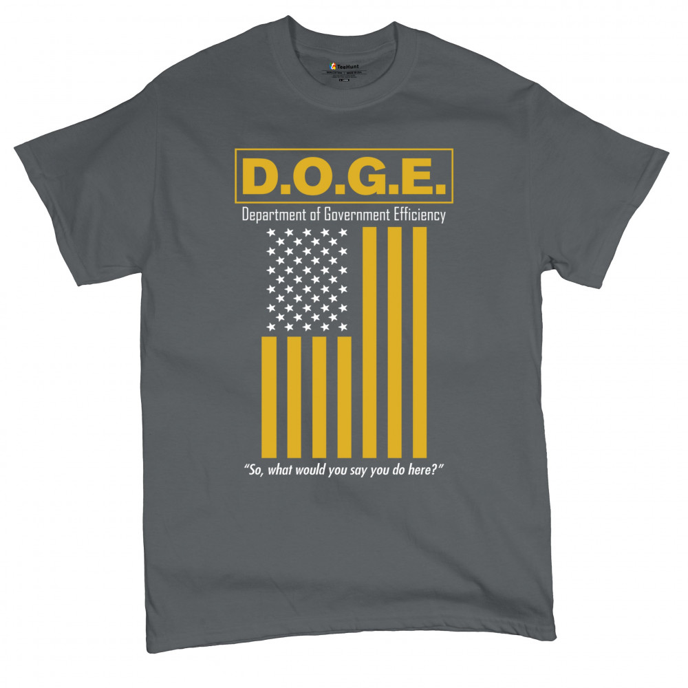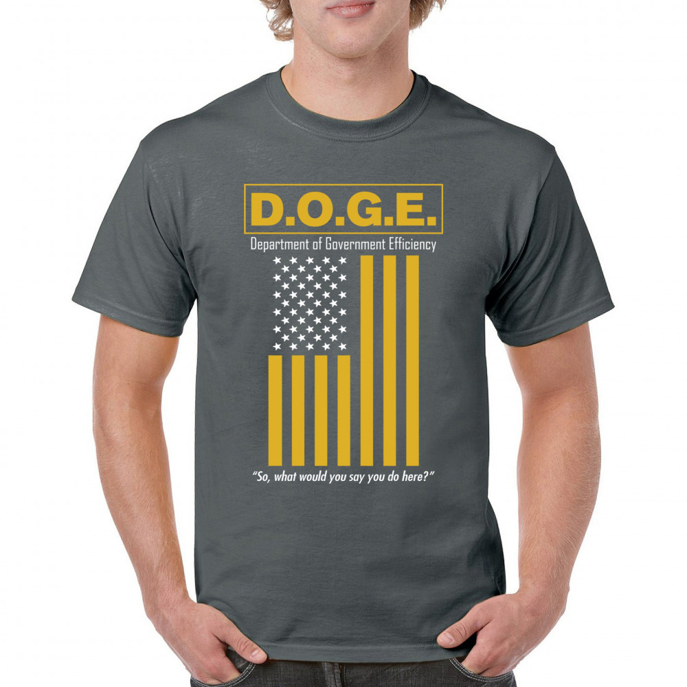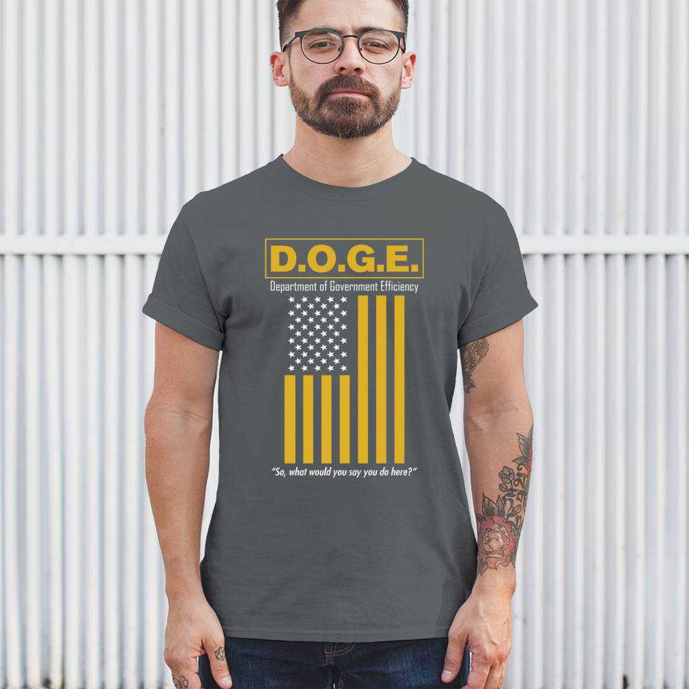 The D.O.G.E. Department of Government Efficiency design features bold yellow lettering and a sarcastic punchline aimed at bloated systems. Clean typography paired with a reimagined American flag gives this political parody retro appeal. Ideal for libertarians, patriots, or anyone fed up with inefficiency and red tape.